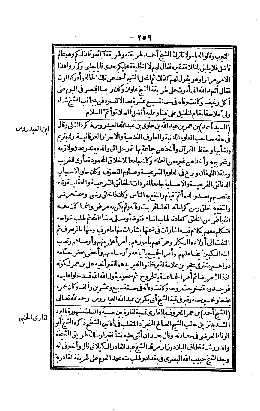 السَّيِّد أَحْمد بن عمر بن عبد الله بن علوي بن عبد الله العيدروس ذكره الشلي وَقَالَ فِي حَقه صَاحب الْعُلُوم اللدنية والمعارف القدسية والأسرار العرفانية ولد تبريم وَنَشَأ بهَا وَحفظ الْقُرْآن وَأخذ عَن جمَاعَة بهَا ثمَّ رَحل إِلَى وَالِده ببندر عدن ولازمه وَتخرج بِهِ وَأخذ عَن غَيره من الْعلمَاء وَكَانَ جَامعا للأخلاق المحمودة مأوى للغريب ومنقذ اللهفان وبرع فِي الْعُلُوم الشَّرْعِيَّة وعلوم التصوف وَكَانَ حاوياً لأسباب الدقائق الفرعية والأصلية جَامعا لمفردات الْحَقَائِق الشَّرْعِيَّة والعقلية وَقَامَ بمنصبهم بعد وَالِده أتم قيام وانتفع بِهِ النَّاس وَكَانَ ذَا خلق رَضِي وسمت مرضِي وانتفع بِهِ خلق وَمن كراماته أَنه لما قربت وفاه وَلم يكن بِهِ مرض وَإِنَّمَا كَانَ مَعَه انقباض من الْخلق كعادته طلب المَاء فَتَوَضَّأ وَصلى مَا شَاءَ الله ثمَّ طلب خواصه فَتكلم مَعَه بِكَلَام فِيهِ إشارات فِي ضمنهَا بشارات مِنْهَا مَا عرف وَمِنْهَا مَا لم يعرف ثمَّ الْتفت إِلَى أَوْلَاده الْكِبَار وعرفهم بأمورهم وَأمر أهل بَيتهمْ أوصاهم وَنصب ابْنه الْكَبِير شَيخا عَلَيْهِم وَأمر الْجَمِيع باتباعه وأصاه بهم وَأعْطى بعض خُدَّامه دَرَاهِم يَشْتَرِي حجرين عَلامَة لقبر فظنوا أَنه يُرِيدهُمَا لقبر أَخِيه عَليّ بن عمر لكَونه إِذْ ذَاك مَرِيضا ثمَّ أَمر الْجَمَاعَة بِالْخرُوجِ ثمَّ سَمِعُوهُ يَقُول الله الله فَدَخَلُوا عَلَيْهِ فوجدوه قد خرجت روحه وَكَانَت وَفَاته فِي سنة سبع وَعشْرين وَألف وَكَانَ عمره بضعاً وَخمسين سنة وقبر فِي قبَّة الشَّيْخ أبي بكر بن عبد الله العيدروس رَحمَه الله تَعَالَى