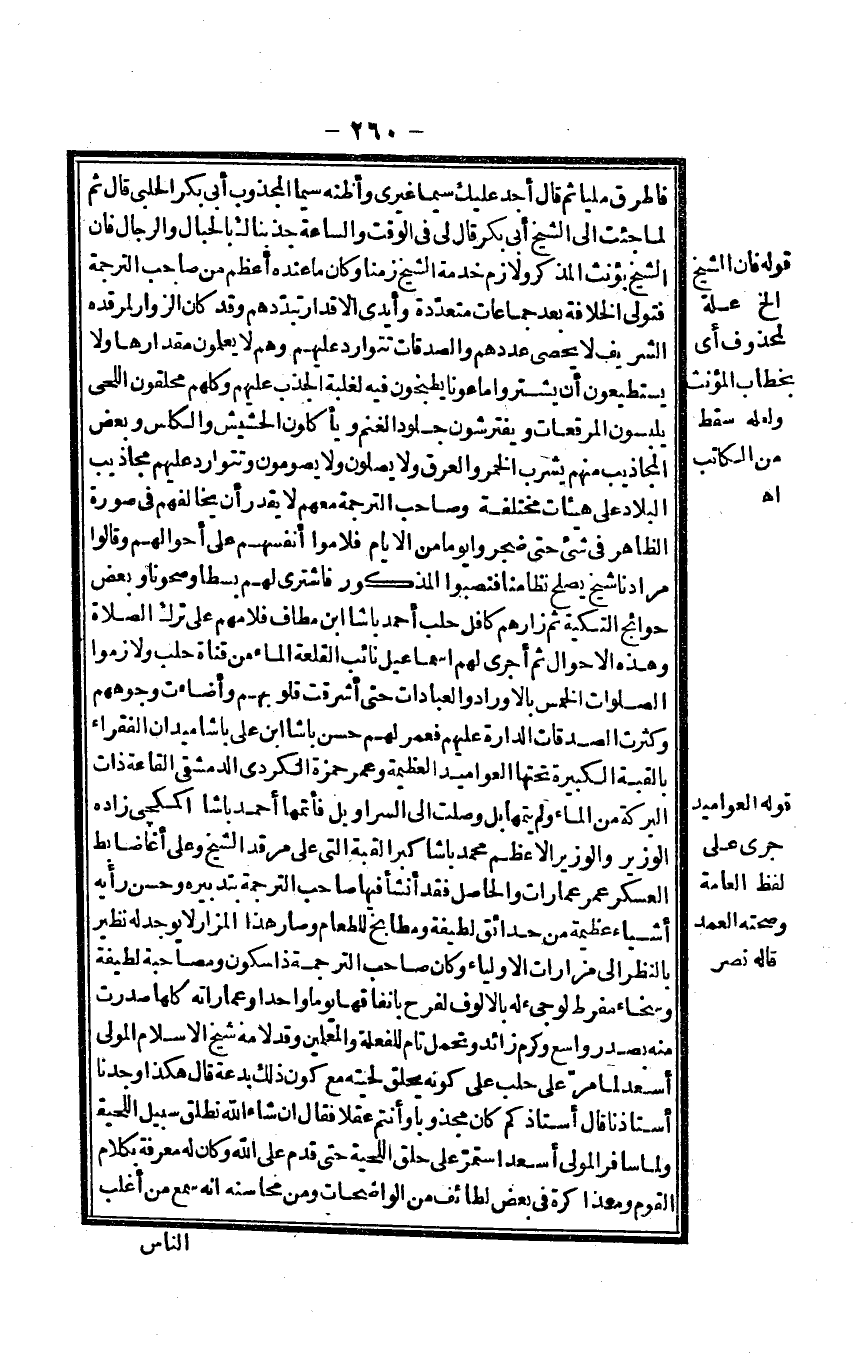فَأَطْرَقَ مَلِيًّا ثمَّ قَالَ أجد عَلَيْك سِيمَا غَيْرِي وَأَظنهُ سِيمَا المجذوب أَبُو بكر الْحلَبِي قَالَ ثمَّ لما جِئْت إِلَى الشَّيْخ أبي بكر قَالَ لي فِي الْوَقْت والساعة جذبناك بالحبال وَالرِّجَال فَإِن الشَّيْخ يؤنث الْمُذكر ولازم خدمَة الشَّيْخ زَمنا وَكَانَ مَا عِنْده أعظم من صَاحب التَّرْجَمَة فَتَوَلّى الْخلَافَة بعد جماعات مُتعَدِّدَة وأيدي الأقدار تبددهم وَقد كَانَ الزوار لمرقده الشريف لَا يُحْصى عَددهمْ وَالصَّدقَات تتوارد عَلَيْهِم وهم لَا يعلمُونَ مقدارها وَلَا يَسْتَطِيعُونَ أَن يشتروا مَاء ونار يطبخون فِيهِ لغَلَبَة الجذب عَلَيْهِم وَكلهمْ محلقون اللحى يلبسُونَ المرقعات ويفترشون جُلُود الْغنم ويأكلون الحشش والكلس وَبَعض المجاذيب مِنْهُم يشرب الْخمر والعرق وَلَا يصلونَ وَلَا يَصُومُونَ وتتوارد عَلَيْهِم مجاذيب الْبِلَاد على هيئات مُخْتَلفَة وَصَاحب التَّرْجَمَة مَعَهم لَا يقدر أَن يخلفهم فِي صُورَة الظَّاهِر فِي شَيْء حَتَّى ضجروا يَوْمًا من الْأَيَّام فلاموا أنفسهم على أَحْوَالهم وَقَالُوا مرادنا شيخ يصلح نظامنا فنصبوا الْمَذْكُور فَاشْترى لَهُم بسطاً وصحوناً وَبَعض حوائج التكية ثمَّ زارهم كافل حلب أَحْمد باشا ابْن مطاف فَلَامَهُمْ على ترك الصَّلَاة وَهَذِه الْأَحْوَال ثمَّ أجْرى لَهُم إِسْمَاعِيل نَائِب القلعة المَاء من قناة حلب ولازموا الصَّلَوَات الْخمس بالأوراد والعبادات حَتَّى أشرقت قُلُوبهم وأضاءت وُجُوههم وَكَثُرت الصَّدقَات الدارة عَلَيْهِم فعمر لَهُم حسن باشا ابْن عَليّ باشا ميدان الْفُقَرَاء بالقبة الْكَبِيرَة تحتهَا العواميد الْعَظِيمَة وَعمر حَمْزَة الْكرْدِي الدِّمَشْقِي القاعة ذَات الْبركَة من المَاء وَلم يُتمهَا بل وصلت إِلَى السَّرَاوِيل فأتمها أَحْمد باشا اكمكحي زَاده الْوَزير والوزير الْأَعْظَم مُحَمَّد باشا كرّ الْقبَّة الَّتِي على مرقد الشَّيْخ وعَلى أغا ضَابِط الْعَسْكَر عمر عمارات وَالْحَاصِل فقد أنشأ فِيهَا صَاحب التَّرْجَمَة بتدبيره وَحسن رَأْيه أَشْيَاء عَظِيمَة من حدائق لَطِيفَة ومطابخ للطعام وَصَارَ هَذَا المزار لَا يُوجد لَهُ نَظِير بِالنّظرِ إِلَى مزارات الْأَوْلِيَاء وَكَانَ صَاحب التَّرْجَمَة ذَا سُكُون ومصاحبة لَطِيفَة وسخاء مفرط لوجىء لَهُ بالألوف لفرح بإنفاقها يَوْمًا وَاحِدًا وعماراته كلهَا صدرت مِنْهُ بصدر وَاسع وكرم زَائِد ة تحمل تَامّ للفعلة والمعلمين وَقد لامه شيخ الْإِسْلَام الْمولى أسعد لما مر على حلب على كَونه يحلق لحيته مَعَ كَون ذَلِك بِدعَة قَالَ هَكَذَا وجدنَا أستاذنا قَالَ أستاذكم كَانَ مجذوباً وَأَنْتُم عقلاء فَقَالَ إِن شَاءَ الله نطلق سَبِيل اللِّحْيَة وَلما سَافر الْمولى أسعد اسْتمرّ على حلق اللِّحْيَة حَتَّى قدم على الله وَكَانَ لَهُ معرفَة بِكَلَام الْقَوْم ومذاكرة فِي بعض لطائف من الواضحات وَمن محاسنه أَنه سمع من أغلب