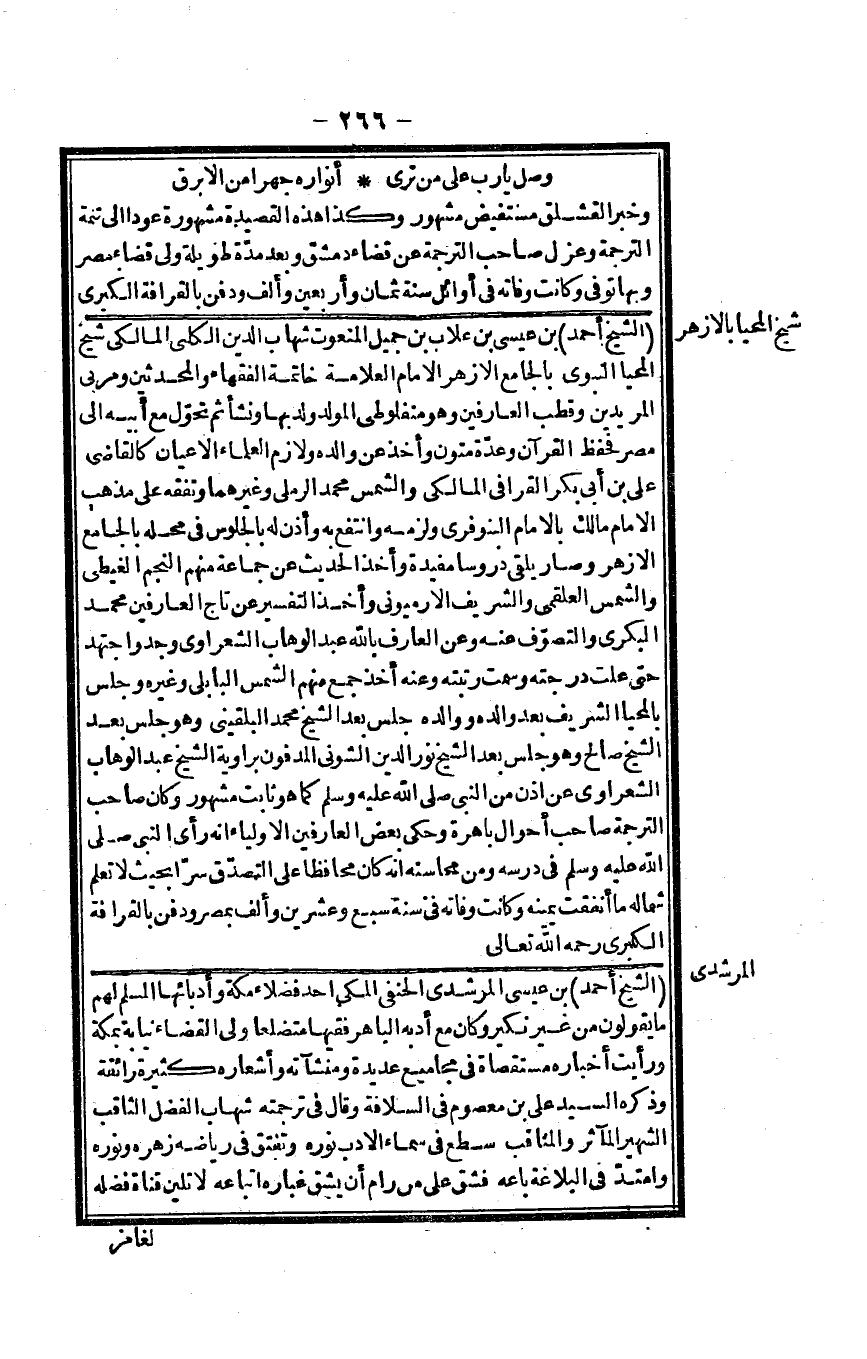 الشَّيْخ أَحْمد بن عِيسَى المرشدي الْحَنَفِيّ الْمَكِّيّ أحد فضلاء مَكَّة وأدبائها الْمُسلم لَهُم مَا يَقُولُونَ من غير نَكِير وَكَانَ مَعَ أدبه الباهر فَقِيها متضلعاً ولي الْقَضَاء نِيَابَة بِمَكَّة وَرَأَيْت أخباره مستقصاة فِي مجاميع عديدة ومنشآته وأشعاره كَثِيرَة رائقة وَذكره السَّيِّد عَليّ بن مَعْصُوم فِي السلافة وَقَالَ فِي تَرْجَمته شهَاب الْفضل الثاقب الشهير المآثر والمناقب سَطَعَ فِي سَمَاء الْأَدَب نوره وتفتق فِي رياضه زهره ونوره وامتد فِي البلاغة بَاعه فشق على من رام أَن يشق غباره اتِّبَاعه لَا تلين قناة فَضله