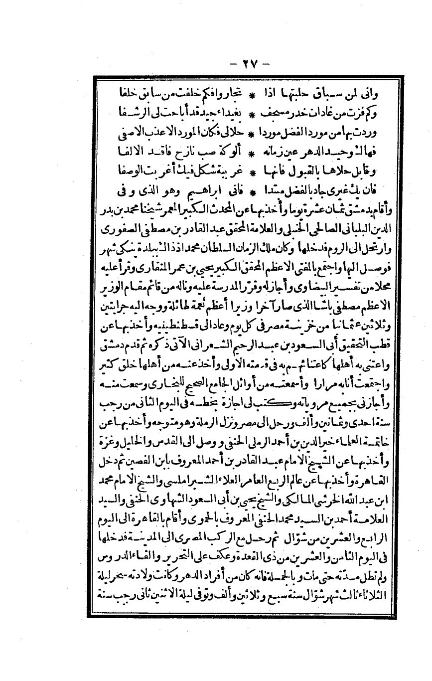 وَأقَام بِدِمَشْق ثَمَان عشرَة يَوْمًا وَأخذ بهَا عَن الْمُحدث الْكَبِير المعمر شَيخنَا مُحَمَّد بن بدر الدّين البلباني الصَّالِحِي الْحَنْبَلِيّ والعلامة الْمُحَقق عبد الْقَادِر بن مصطفى الصفوري وارتحل إِلَى الرّوم فَدَخلَهَا وَكَانَ ملك الزَّمَان السُّلْطَان مُحَمَّد إِذْ ذَاك ببلدة ينكي شهر فوصل إِلَيْهَا وَاجْتمعَ بالمفتي الْأَعْظَم الْمُحَقق الْكَبِير يحيى بن عمر المنقاري وَقَرَأَ عَلَيْهِ محلا من تَفْسِير الْبَيْضَاوِيّ وَأَجَازَ لَهُ وَقرر الْمدرسَة عَلَيْهِ وناله من قَائِم مقَام الْوَزير الْأَعْظَم مصطفى باشا الَّذِي صَار آخرا وزيراً أعظم نعْمَة طائلة وَوجه إِلَيْهِ جرايتين وَثَلَاثِينَ عثمانياً من خزينة مصر فِي كل يَوْم وَعَاد إِلَى قسطنطينية وَأخذ بهَا عَن قطب التَّحْقِيق أبي السُّعُود بن عبد الرَّحِيم الشعراني الْآتِي ذكره ثمَّ قدم دمشق واعتنى بِهِ أَهلهَا كاعتنائهم بِهِ فِي قِيمَته الأولى وَخذ عَنهُ من أَهلهَا خلق كثير وَاجْتمعت أَنا بِهِ مرَارًا وأسمعته من أَوَائِل الْجَامِع الصَّحِيح للْبُخَارِيّ وَسمعت مِنْهُ وأجازني بِجَمِيعِ مروياته وَكتب لي إجَازَة بِخَطِّهِ فِي الْيَوْم الثَّانِي من رَجَب سنة إِحْدَى وَثَمَانِينَ وَألف ورحل إِلَى مصر وَنزل الرملة وَهُوَ مُتَوَجّه وَأخذ بهَا عَن خَاتِمَة الْعلمَاء خير الدّين بن أَحْمد الرَّمْلِيّ الْحَنَفِيّ وَوصل إِلَى الْقُدس والخليل وغزة وَأخذ بهَا عَن الشَّيْخ الإِمَام عبد الْقَادِر بن أَحْمد الْمَعْرُوف بِابْن الفصين ثمَّ دخل الْقَاهِرَة وَأخذ بهَا عَن عَالم الرّبع العامر الْعَلَاء الشبراملسي وَالشَّيْخ الإِمَام مُحَمَّد ابْن عبد الله الْخَرشِيّ الْمَالِكِي وَالشَّيْخ يحيى بن أبي السُّعُود الشهاوي الْحَنَفِيّ وَالسَّيِّد الْعَلامَة أَحْمد بن السَّيِّد مُحَمَّد الْحَنَفِيّ الْمَعْرُوف بالحموي وَأقَام بِالْقَاهِرَةِ إِلَى الْيَوْم الرَّابِع وَالْعِشْرين من شَوَّال ثمَّ رَحل مَعَ الركب الْمصْرِيّ إِلَى الْمَدِينَة فَدَخلَهَا فِي الْيَوْم الثَّامِن وَالْعِشْرين من ذِي الْقعدَة وَعَكَفَ على التَّحْرِير والقاء الدُّرُوس وَلم تطل مدَّته حَتَّى مَاتَ وَبِالْجُمْلَةِ فَإِنَّهُ كَانَ من أَفْرَاد الدَّهْر وَكَانَت وِلَادَته سحر لَيْلَة الثُّلَاثَاء ثَالِث شهر شَوَّال سنة سبع وَثَلَاثِينَ وَألف وَتُوفِّي لَيْلَة الِاثْنَيْنِ ثَانِي رَجَب سنة