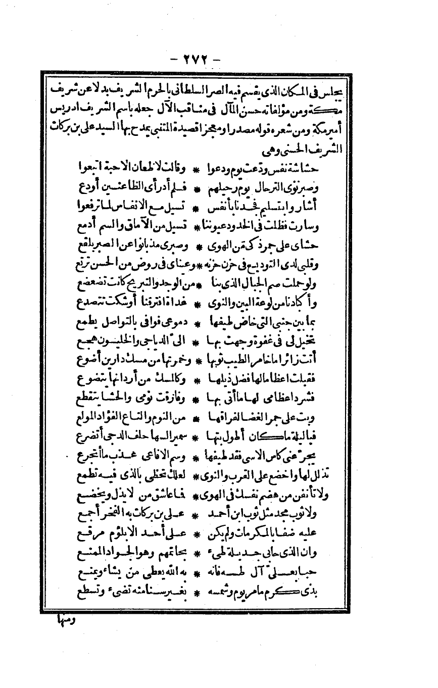 يجلس فِي الْمَكَان الَّذِي يقسم فِيهِ الصر السلطاني بِالْحرم الشريف بَدَلا عَن شرِيف مَكَّة وَمن مؤلفاته حسن الْمَآل فِي مَنَاقِب الْآل جعله باسم الشريف إِدْرِيس أَمِير مَكَّة وَمن شعره قَوْله مصدرا ومعجزاً قصيدة المتنبي يمدح بهَا السَّيِّد عَليّ بن بَرَكَات الشريف الحسني وَهِي