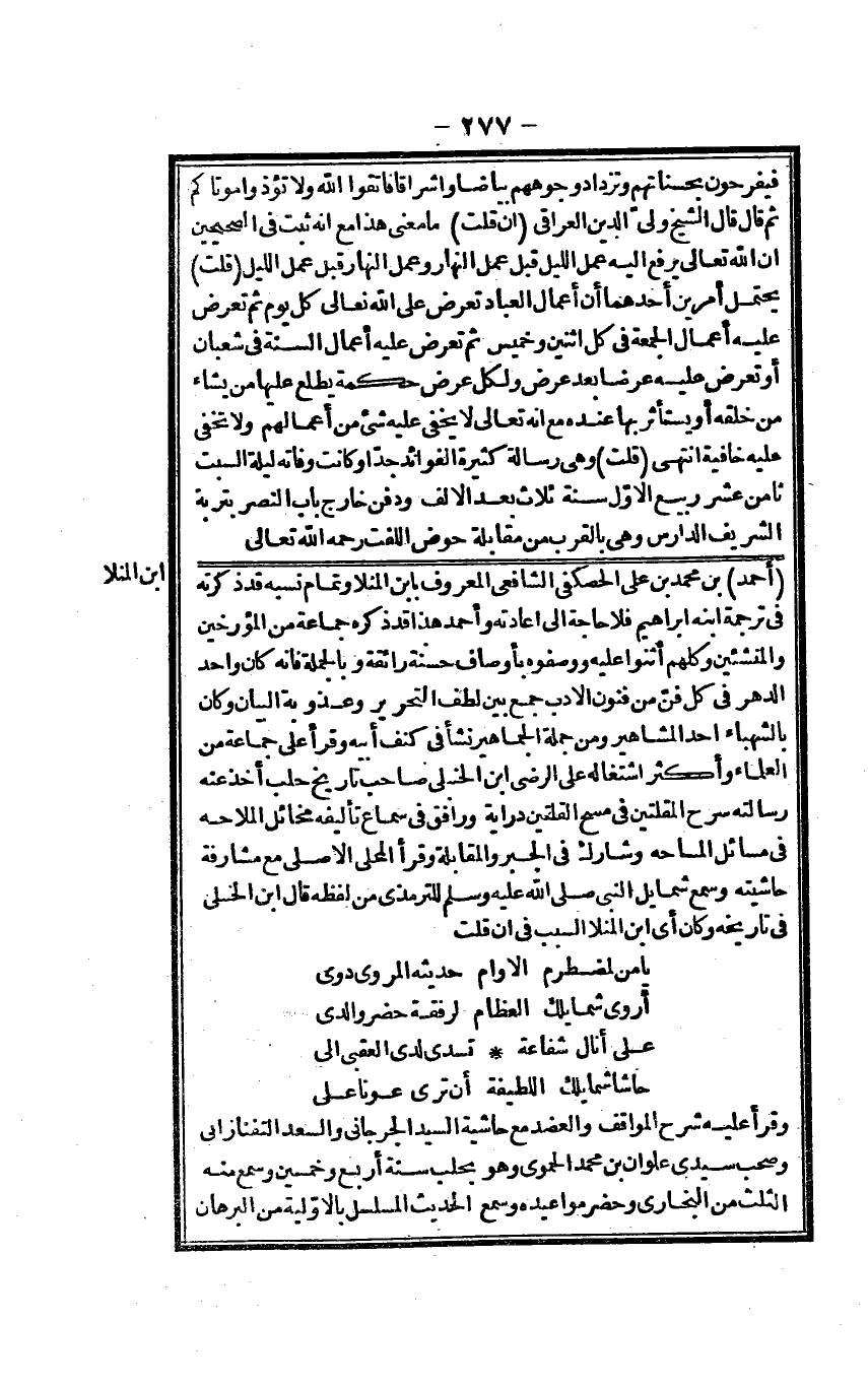 أَحْمد بن مُحَمَّد بن عَليّ الحصكفي الشَّافِعِي الْمَعْرُوف بِابْن المنلا وَتَمام نسبه وَقد ذكرته فِي يترجمة ابْنه إِبْرَاهِيم فَلَا حَاجَة إِلَى إِعَادَته وَأحمد هَذَا قد ذكره جمَاعَة من المؤرخين والمنشئين وَكلهمْ أثنوا عَلَيْهِ ووصفوه بأوصاف حَسَنَة رائقة وَبِالْجُمْلَةِ فَإِنَّهُ كَانَ وَاحِد الدَّهْر فِي كل فن من فنون الْأَدَب جمع بَين لطف التَّحْرِير وعذوبة الْبَيَان وَكَانَ بالشهباء أحد الْمَشَاهِير وَمن جملَة الجماهير نَشأ فِي كنف أَبِيه وَقَرَأَ على جمَاعَة من الْعلمَاء وَأكْثر اشْتِغَاله على الرضي ابْن الْحَنْبَلِيّ صَاحب تَارِيخ حلب أَخذ عَنهُ رسَالَته سرح المقلتين فِي مسح الْقبْلَتَيْنِ دراية ورافق فِي سَماع تأليفه مخائل الملاحة فِي مسَائِل المساحة وشارك فِي الْجَبْر والمقابلة وَقَرَأَ الْمحلي الْأَصْلِيّ مَعَ مشارفة حَاشِيَته وَسمع شمايل النَّبِي