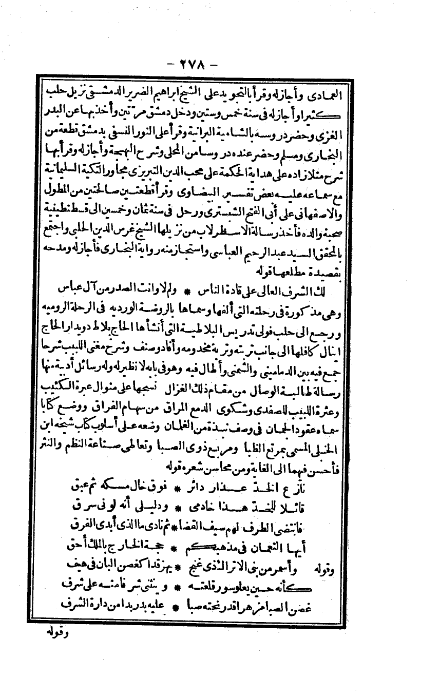 الْعِمَادِيّ وَأَجَازَ لَهُ وَقَرَأَ بالتجويد على الشَّيْخ إِبْرَاهِيم الضَّرِير الدِّمَشْقِي نزيل حلب كثيرا وَأَجَازَ لَهُ فِي سنة خمس وَسِتِّينَ وَدخل دمشق مرَّتَيْنِ وَأخذ بهَا عَن الْبَدْر الْغَزِّي وَحضر دروسه بالشامية البرانية وَقَرَأَ على النُّور النَّسَفِيّ بِدِمَشْق مطعه من البُخَارِيّ وَمُسلم وَحضر عِنْده دروساً من الْمحلى وَشرح الْبَهْجَة وَأَجَازَ لَهُ وَقَرَأَ بهَا شرح منلا زَاده على هِدَايَة الْحِكْمَة على محب الدّين التبريزي مجاور التكية السليمانية مَعَ سَمَاعه عَلَيْهِ بعض تَفْسِير الْبَيْضَاوِيّ وَقَرَأَ قطعتين صالحتين من المطول والأصفهاني على أبي الْفَتْح الشبستري ورحل فِي سنة ثَمَان وَخمسين إِلَى قطسنطينية صَحبه وَالِده فَأخذ رِسَالَة الاسطرلاب من نزيلها الشَّيْخ غرس الدّين الْحلَبِي وَاجْتمعَ بالمحقق السَّيِّد عبد الرَّحِيم العباسي واستجاز مِنْهُ رِوَايَة البُخَارِيّ فَأجَاز لَهُ ومدحه بقصيدة مطْلعهَا قَوْله