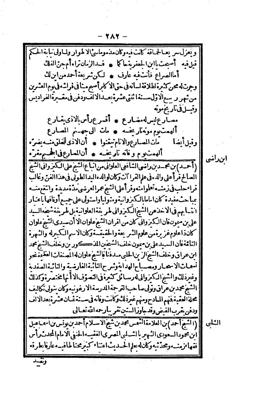 أَحْمد بن مُحَمَّد بن راضي الشَّافِعِي العلواني من أَتبَاع الشَّيْخ عَليّ الكيزواني الشَّيْخ الصَّالح قَرَأَ على وَالِده فِي علم القراآت وَكَانَ لوالده الْيَد الطولي فِي هَذَا الْفَنّ وغالب قراء حلب فِي زَمَنه تعلمُوا مِنْهُ وَقَرَأَ على الشَّيْخ عمر العرضي مُدَّة مديدة وانتفع مِنْهُ بمباحث مفيدة كَانَ إِمَامًا بالكيزوانية ومتولياً وَاسْتولى على جَمِيع أوقافها بِاعْتِبَار انتسابهم فِي الْأَخْذ عَن الشَّيْخ الكيزواني طَريقَة العلوانية بل طَريقَة شَيْخه السَّيِّد عَليّ بن مَيْمُون فَإِن الكيزواني كَانَ من أَقْرَان الشَّيْخ علوان إِلَّا أَن سَيِّدي الشَّيْخ علوان كَانَ ذَا عُلُوم غزيرة من عُلُوم الشَّرِيعَة والحقيقة وَكَانَ الِاسْم الْكَبِير لَهُ والشهرة التَّامَّة فَإِن السَّيِّد عَليّ بن مَيْمُون خلف الشَّيْخَيْنِ الْمَذْكُورين وَخلف الشَّيْخ مُحَمَّد ابْن عراق وَخلف الشَّيْخ الزين الْحلَبِي مدفناً بالشيخ علوان لَهُ المصنفات الْعَظِيمَة نَحْو نسمات الأسحار ومصباح الْهِدَايَة وَشرح التائية الفارضية والتائية الصفدية وَغير ذَلِك وَالشَّيْخ الكيزواني لَهُ رسائل كَثِيرَة فِي التصوف إِلَّا أَنَّهَا مختصرة وَكَذَلِكَ الشَّيْخ مُحَمَّد بن عراق وَتَوَلَّى صَاحب التَّرْجَمَة لمدرسة الاغونية وَكَانَ يتَوَلَّى تكاليف محلّة الْعقبَة فَمنهمْ المادح وَمِنْهُم غير ذَلِك وَكَانَت وَفَاته فِي سنة ثَمَان عشرَة بعد الْألف وَدفن بِقرب الْفَيْض وَقد جَاوز السِّتين تَقْرِيبًا رَحمَه الله تَعَالَى