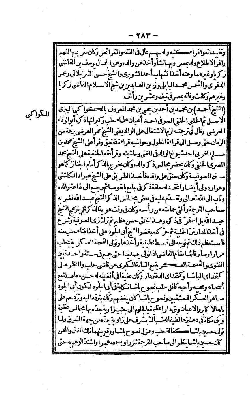 الشَّيْخ أَحْمد بن مُحَمَّد بن أَحْمد بن يحيى بن مُحَمَّد الْمَعْرُوف بالكواكبي البيري الأَصْل ثمَّ الْحلَبِي الْحَنَفِيّ الصُّوفِي أحد أَعْيَان عُلَمَاء حلب وكبرائها ذكره أَبُو الْوَفَاء العرضي وَقَالَ فِي تَرْجَمته لزم الِاشْتِغَال على الْوَالِد يَعْنِي الشَّيْخ عمر العرضي بُرْهَة من الزَّمَان حَتَّى وصل إِلَى قِرَاءَة المطول وحواشيه قِرَاءَة تَحْقِيق وَقَرَأَ على الشَّيْخ مُحَمَّد بن مُسلم المغربي أحد شُيُوخ الْوَالِد فِي الْمُغنِي وحاشيته وَقَرَأَ فقه الْحَنَفِيَّة على الشَّيْخ مُحَمَّد الْمصْرِيّ الْحَنَفِيّ وَكَانَ يحضر مجَالِس ذكر وَالِده وَكَانَ يخرج بِالذكر أَمَام الْجَنَائِز كَمَا هُوَ سنَن الصُّوفِيَّة وَكَانَ حنق على وَالِده فَأخذ الطَّرِيق على الشَّيْخ عيواد الكلشني وَهُوَ ارد ولي أَيْضا وَاتخذ لَهُ حَلقَة ذكر فِي جَامع بانقوسا ثمَّ رَجَعَ إِلَى طَاعَة وَالِده وَتَابَ إِلَى الله تَعَالَى وَتقدم عَلَيْهِ فِي بعض مجَالِس الذّكر الشَّيْخ عبد الله فَضَربهُ صَاحب التَّرْجَمَة وَألقى عمَامَته عَن رَأسه وَكَانَ فِي وَقت هوية الذّكر فَلم ينزعج الشَّيْخ عبد الله بل اسْتمرّ فِي ذكره وَهَذَا خلق حسن عَظِيم ثمَّ ترك زِيّ الصُّوفِيَّة وَشرع فِي أَخذ الْمدَارِس الحلبية ثمَّ حركه مبغضو الشَّيْخ أبي الْجُود على أَخذ إِفْتَاء حلب مِنْهُ فاستعظم ذَلِك ثمَّ توجه إِلَى قسطنطينية وَأَخذهَا وَتَوَلَّى الْقِسْمَة العسكرية بحلب مرَارًا وَصَارَ قَائِما مقَام القَاضِي إِذا تولى جَدِيدا حَتَّى جمع فِي سنة وَاحِدَة بَين التفوى وَالْقِسْمَة العسكرية مَعَ النِّيَابَة الْكُبْرَى عَن قَاضِي حلب وَالنَّظَر على كتخداي الباشا وكتخداي الدفتر دَار وَكَانَ عفيفاً فِي أقضيته لَهُ حسن مُعَاملَة مَعَ أَصْحَابه ومحبيه وأحبه كافل حلب نصوح باشا نكاية فِي أبي الْجُود لكَون أبي الْجُود صاهر الْعَسْكَر الدمشقيين ونصوح باشا كَانَ يبغضهم وَكَانَ يتَرَدَّد إِلَيْهِ وتزدحم على بَابه الأكابر والأعيان وَبنى دَارا عَظِيمَة بالجلوم إِلَى جنب زَاوِيَة جده بهَا مجَالِس عَظِيمَة وَبنى مَكَانا فِي دهليزها لطيفاً لَهُ شباك مشرف على زَاوِيَة جده من جِهَة الشرق وَلما تولى حُسَيْن باشا كَفَالَة حلب وعزل نصوح باشا وَوَقع بَينهمَا تِلْكَ الْفِتَن والمحن وَكَانَ حُسَيْن باشا ينظر إِلَى صَاحب التَّرْجَمَة شزراً ويسمعه هجراً وَاشْتَدَّ الْوَهم بِهِ حَتَّى