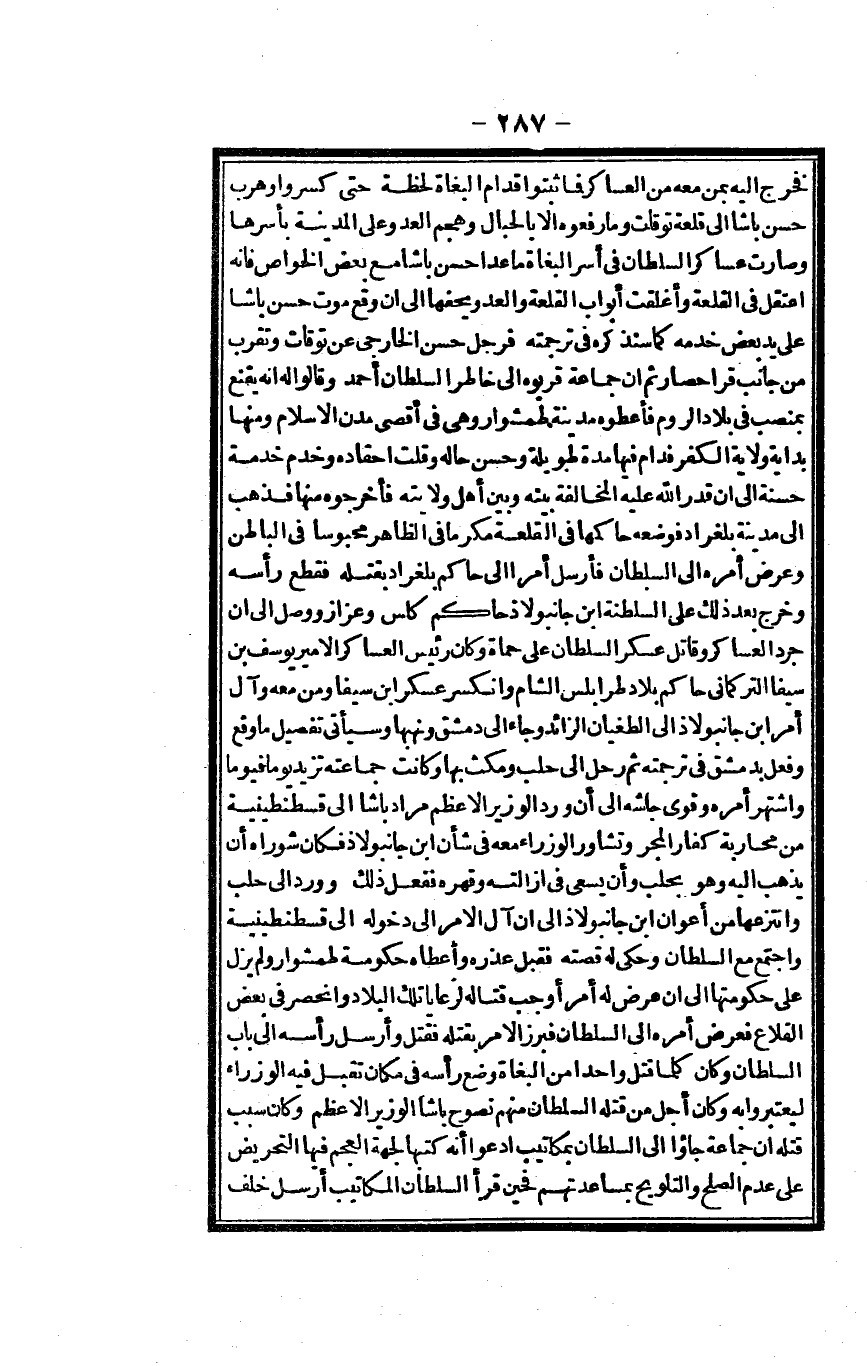 فَخرج إِلَيْهِ بِمن مَعَه من العساكر فَمَا ثبتوا قُدَّام الْبُغَاة لَحْظَة حَتَّى كسروا وهرب حسن باشا إِلَى قلعة توقات وَمَا رفعوا إِلَّا بالحبال وهجم الْعَدو وعَلى الْمَدِينَة بأسرها وَصَارَت عَسَاكِر السُّلْطَان فِي أسر الْبُغَاة مَا عدا حسن باشا مَعَ بعض الْخَواص فَإِنَّهُ اعتقل فِي القلعة وأغلقت أَبْوَاب القلعة والعدو يحفها إِلَى أَن وَقع موت حسن باشا على يَد بعض خدمه كَمَا سَنذكرُهُ فِي تَرْجَمته فَرَحل حسن الْخَارِجِي عَن توقات وتقرب من جَانب قَرَأَ حِصَار ثمَّ إِن جمَاعَة قربوه إِلَى خاطر السُّلْطَان أَحْمد وَقَالُوا لَهُ أَن يقنع بِمنْصب فِي بِلَاد الرّوم فَأَعْطوهُ مَدِينَة طمشوار وَهِي فِي أقْصَى مدن الْإِسْلَام وَمِنْهَا بداية ولَايَة الْكفْر فدام فِيهَا مُدَّة طَوِيلَة وَحسن حَاله وَقلت أحقاده وخدم خدمَة حَسَنَة إِلَى أَن قدر الله عَلَيْهِ الْمُخَالفَة بَينه وَبَين أهل ولَايَته فأخرجوه مِنْهَا فَذهب إِلَى مَدِينَة بلغراد فَوَضعه حاكمها فِي القلعة مكرما فِي الظَّاهِر مَحْبُوسًا فِي الْبَاطِن وَعرض أمره إِلَى السُّلْطَان فَأرْسل أَمر إِلَى حَاكم بلغراد بقتْله فَقطع رَأسه وَخرج بعد ذَلِك على السلطنة ابْن جانبو لاذحاكم كاس وعزاز وَوصل إِلَى أَن جرد العساكر وَقَاتل عَسْكَر السُّلْطَان على حماة وَكَانَ رَئِيس العساكر الْأَمِير يُوسُف بن سَيْفا التركماني حَاكم بِلَاد طرابلس الشَّام وانكسر عَسْكَر ابْن سَيْفا وَمن مَعَه وَآل أَمر ابْن جانبولاذ إِلَى الطغيان الزَّائِد وَجَاء إِلَى دمشق ونهبها وَسَيَأْتِي تَفْصِيل مَا وَقع وَفعل بِدِمَشْق فِي تَرْجَمته ثمَّ رَحل إِلَى حلب وَمكث بهَا وَكَانَت جماعته تزيد يَوْمًا فيوما واشتهر أمره وقوى جاشه إِلَى أَن ورد الْوَزير الْأَعْظَم مُرَاد باشا إِلَى قسطنطينية من محاربة كفار المجر وتشاور الوزراء مَعَه فِي شَأْن ابْن جانبولاذ فَكَانَ شوراه أَن يذهب إِلَيْهِ وَهُوَ بحلب وَأَن يسْعَى فِي إِزَالَته وقهره فَفعل ذَلِك وَورد إِلَى حلب وانتزعها من أعوان ابْن جانبولاذ إِلَى أَن آل الْأَمر إِلَى دُخُوله إِلَى قسطنطينية وَاجْتمعَ مَعَ السُّلْطَان وَحكى لَهُ قصَّته فَقبل عذره وَأَعْطَاهُ حُكُومَة طمشوار وَلم يزل على حكومتها إِلَى أَن عرض لَهُ أَمر أوجب قِتَاله لرعايا تِلْكَ الْبِلَاد وانحصر فِي بعض القلاع فَعرض أمره إِلَى السُّلْطَان فبرز الْأَمر بقتْله فَفَتَلَ وَأرْسل رَأسه إِلَى بَاب السُّلْطَان وَكَانَ كلما قتل وَاحِدًا من الْبُغَاة وضع رَأسه فِي مَكَان تقبل فِي الوزراء ليعتبروا بِهِ وَكَانَ أجل من قَتله السُّلْطَان مِنْهُم نصوح باشا الْوَزير الْأَعْظَم وَكَانَ سَبَب قَتله أَن جمَاعَة جاؤا إِلَى السُّلْطَان بمكاتيب ادعوا أَنه كتبهَا الْجِهَة الْعَجم فِيهَا التحريض على عدم الصُّلْح والتلويح بمساعدتهم فحين قَرَأَ السُّلْطَان المكاتيب أرسل خلف