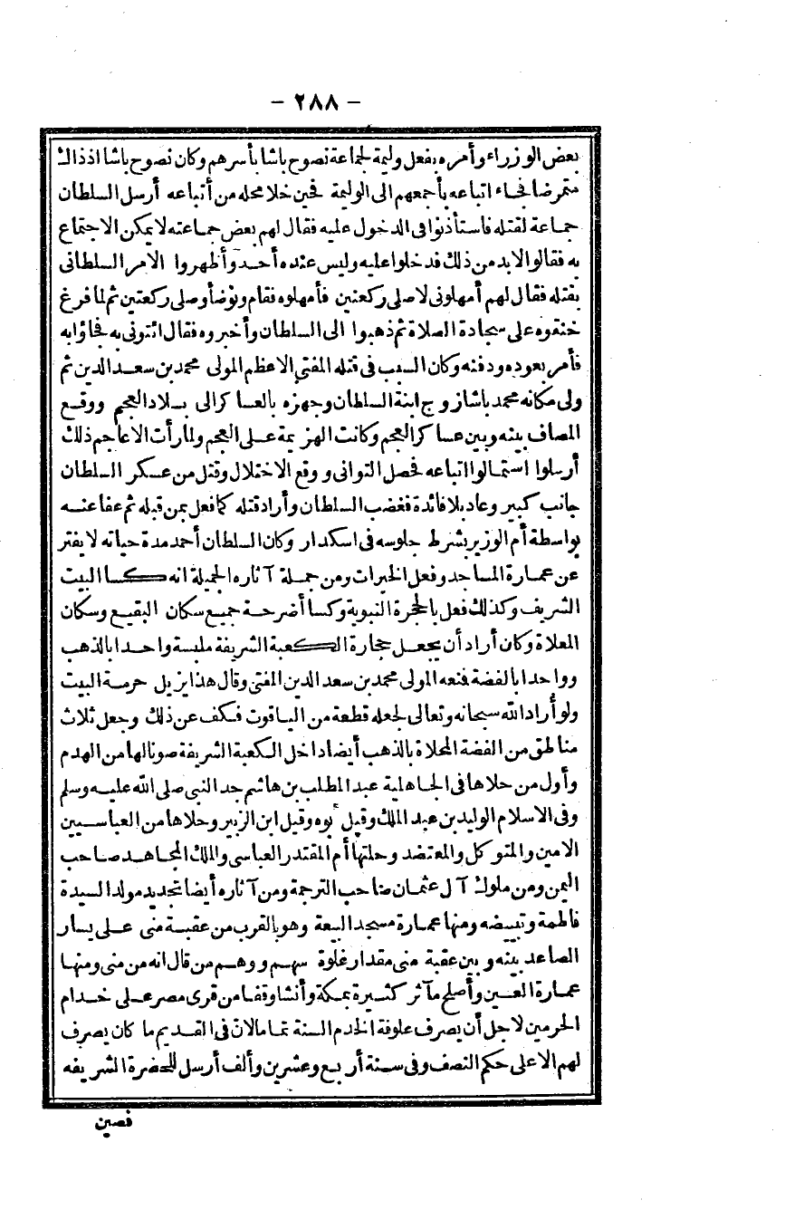 بعض الوزراء وَأمر بِفعل وَلِيمَة لجَماعَة نصوح باشا إِذْ ذَاك متمرضاً فجَاء أَتْبَاعه بأجمعهم إِلَى الْوَلِيمَة فحين خلا مَحَله من أَتْبَاعه أرسل السُّلْطَان جمَاعَة لقَتله فَاسْتَأْذنُوا فِي الدُّخُول عَلَيْهِ فَقَالَ لَهُم بعض جماعته لَا يُمكن الِاجْتِمَاع بِهِ فَقَالُوا لَا بُد من ذَلِك فَدَخَلُوا عَلَيْهِ وَلَيْسَ عِنْده أحد وأظهروا الْأَمر السلطاني بقتْله فَقَالَ لَهُم أمهلوني لأصلي رَكْعَتَيْنِ فأمهلوه فَقَامَ وَتَوَضَّأ وَصلى رَكْعَتَيْنِ ثمَّ لما فرغ خنقوه على سجادة الصَّلَاة ثمَّ ذَهَبُوا إِلَى السُّلْطَان وَأَخْبرُوهُ فَقَالَ ائْتُونِي بِهِ فجاؤا بِهِ فَأمر بعوده وَدَفنه وَكَانَ السَّبَب فِي قَتله الْمُفْتِي الْأَعْظَم الْمولى مُحَمَّد بن سعد الدّين ثمَّ ولي مَكَانَهُ مُحَمَّد باشا زوج ابْنة السُّلْطَان وجهزه بالعساكر إِلَى بِلَاد الْعَجم وَوَقع المصاف بَينه وَبَين عَسَاكِر الْعَجم وَكَانَت الْهَزِيمَة على الْعَجم وَلما رَأَتْ الْأَعَاجِم ذَلِك أرْسلُوا استمالوا أَتْبَاعه فَحصل التواني وَوَقع الاختلال وَقتل من عَسْكَر السُّلْطَان جَانب كَبِير وَعَاد بِلَا فَائِدَة فَغَضب السُّلْطَان وَأَرَادَ قَتله كَمَا فعل بِمن قبله ثمَّ عَفا عَنهُ بِوَاسِطَة أم الْوَزير بِشَرْط جُلُوسه فِي اسكدار وَكَانَ السلسطان أَحْمد مُدَّة حَيَاته لَا يفتر عَن عمَارَة الْمَسَاجِد وَفعل الْخيرَات وَمن جملَة آثاره الجميلة أَنه كسا الْبَيْت الشريف وَكَذَلِكَ فعل بالحجرة النَّبَوِيَّة وكسا أضرحة جَمِيع سكان البقيع وسكان المعلاة وَكَانَ أَرَادَ أَن يَجْعَل حِجَارَة الْكَعْبَة الشَّرِيفَة ملبسة وَاحِدًا بِالذَّهَب وواحداً بِالْفِضَّةِ فَمَنعه الْمولى مُحَمَّد بن سعد الدّين الْمُفْتِي وَقَالَ هَذَا يزِيل حُرْمَة الْبَيْت وَلَو أَرَادَ الله سُبْحَانَهُ وَتَعَالَى لجعله قِطْعَة من الْيَاقُوت فَكف عَن ذَلِك وَجعل ثَلَاث مناطق من الْفضة المحلاة بِالذَّهَب أَيْضا دَاخل الْكَعْبَة الشَّرِيفَة صونا لَهَا من الْهدم وَأول من حلاها فِي الْجَاهِلِيَّة عبد الْمطلب بن هَاشم جد النَّبِي