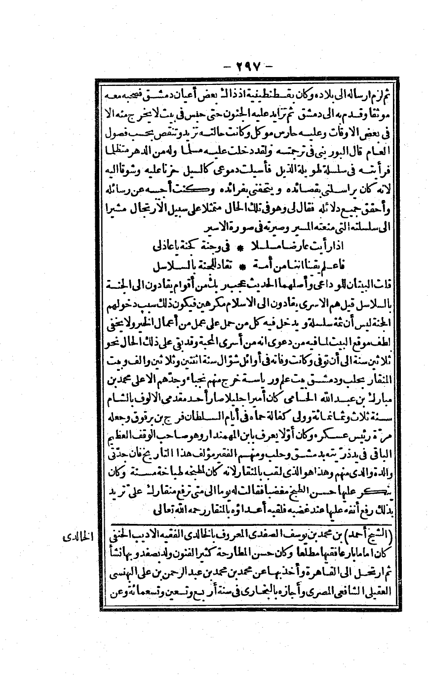 الشَّيْخ أَحْمد بن مُحَمَّد بن يُوسُف الصَّفَدِي الْمَعْرُوف بالخالدي الْفَقِيه الأديب الْحَنَفِيّ كَانَ إِمَامًا بارعا فَقِيها مطلعا وَكَانَ حسن المطارحة كثير الْفُنُون ولد بصفد وَبهَا نَشأ ثمَّ ارتحل إِلَى الْقَاهِرَة وَأخذ بهَا عَن مُحَمَّد بن مُحَمَّد بن عبد الرَّحْمَن بن عَليّ البهنسي الْعقيلِيّ الشَّافِعِي الْمصْرِيّ وَأَجَازَهُ بالبخاري فِي سنة أَربع وَتِسْعين وَتِسْعمِائَة وَعَن
