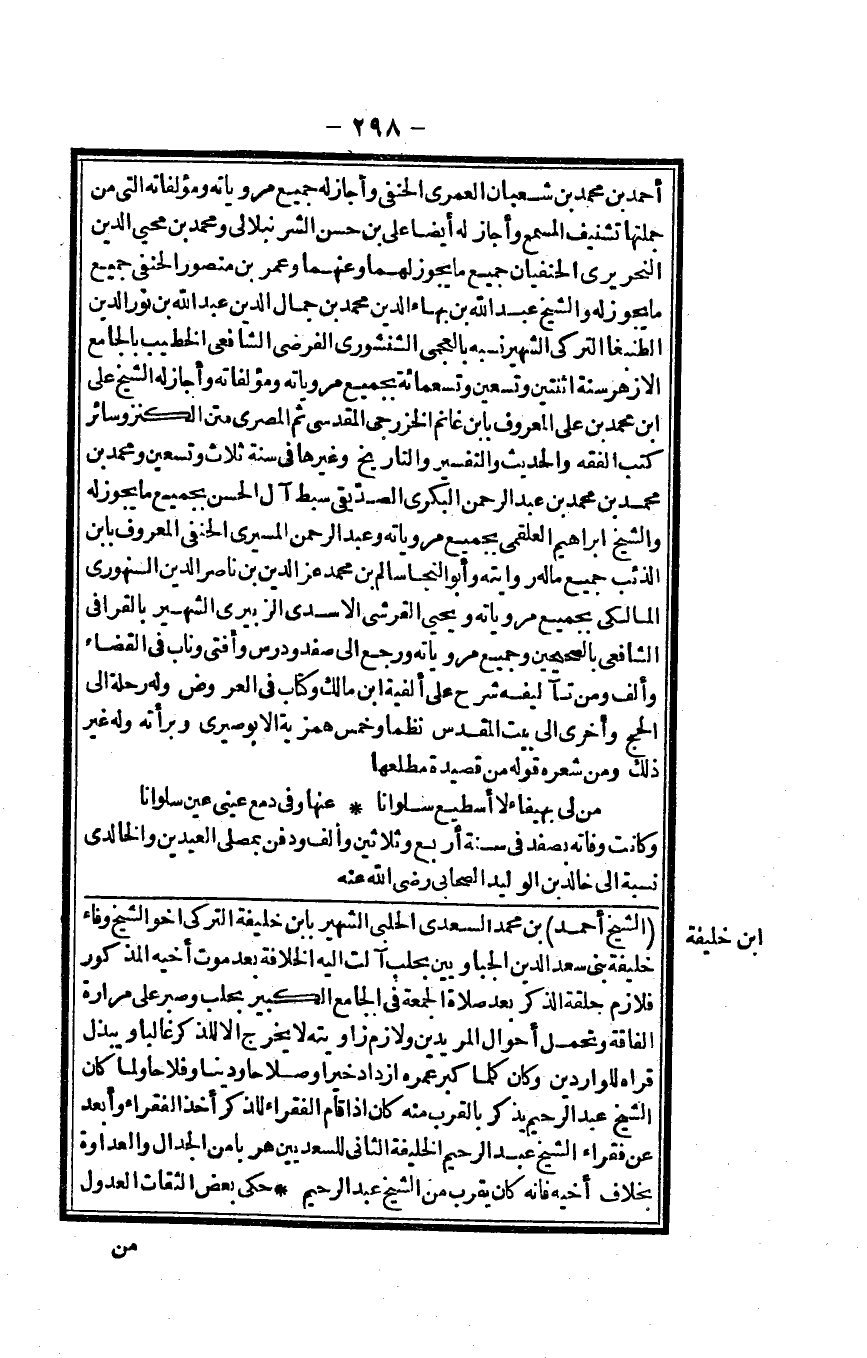 الشَّيْخ أَحْمد بن مُحَمَّد السَّعْدِيّ الْحلَبِي الشهير بِابْن خَليفَة التركي أَخُو الشَّيْخ وَفَاء خَليفَة بني سعد الدّين الجباويين بحلب آلت إِلَيْهِ الْخلَافَة بعد موت أَخِيه الْمَذْكُور فلازم حَلقَة الذّكر بعد صَلَاة الْجُمُعَة فِي الْجَامِع الْكَبِير بحلب وصبر على مرَارَة الْفَاقَة وَتحمل أَحْوَال المريدين ولازم زاويته لَا يخرج إِلَّا للذّكر غَالِبا ويبذل قراه للواردين وَكَانَ كلما كبر عمره ازْدَادَ خيرا وصلاحا ودينا وفلاحا وَلما كَانَ الشَّيْخ عبد الرَّحِيم يذكر بِالْقربِ مِنْهُ كَانَ إِذا قَامَ الْفُقَرَاء للذّكر أَخذ الْفُقَرَاء وَأبْعد عَن فُقَرَاء الشَّيْخ عبد الرَّحِيم الْخَلِيفَة الثَّانِي للسعديين هربا من الْجِدَال والعداوة بِخِلَاف أَخِيه فَإِنَّهُ كَانَ يقرب من الشَّيْخ عبد الرَّحِيم حكى بعض الثِّقَات الْعُدُول