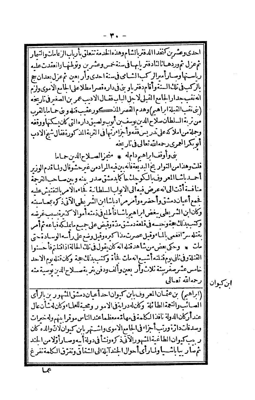 إِبْرَاهِيم بن عُثْمَان الْمَعْرُوف بِابْن كيوان أحد أَعْيَان دمشق الْمَشْهُورين بِالرَّأْيِ الصائب وَالنعْمَة الطائلة وَكَانَ لَهُ دراية فِي الْأُمُور ومحبة للْعُلَمَاء وَكَانَ لَهُ شَأْن عَال عِنْد أَرْكَان الدولة نَافِذ الْكَلِمَة فِي مهامة مُعظما عِنْد النَّاس موقراً بَينهم وَله خيرات وصدقات دارة ورتب أَجزَاء فِي الْجَامِع الْأمَوِي واشتهر بِابْن كيوان لِأَن وَالِده كَانَ ربيب كيوان الطاغية الْمَشْهُور الْآتِي ذكره وَنَشَأ فِي دولة أَبِيه وَصَارَ أَولا من الْجند ثمَّ صَار يياباشيا وَلما رأى أَحْوَال الْجند آيلة إِلَى الشقاق وتفرق الْكَلِمَة تفرغ