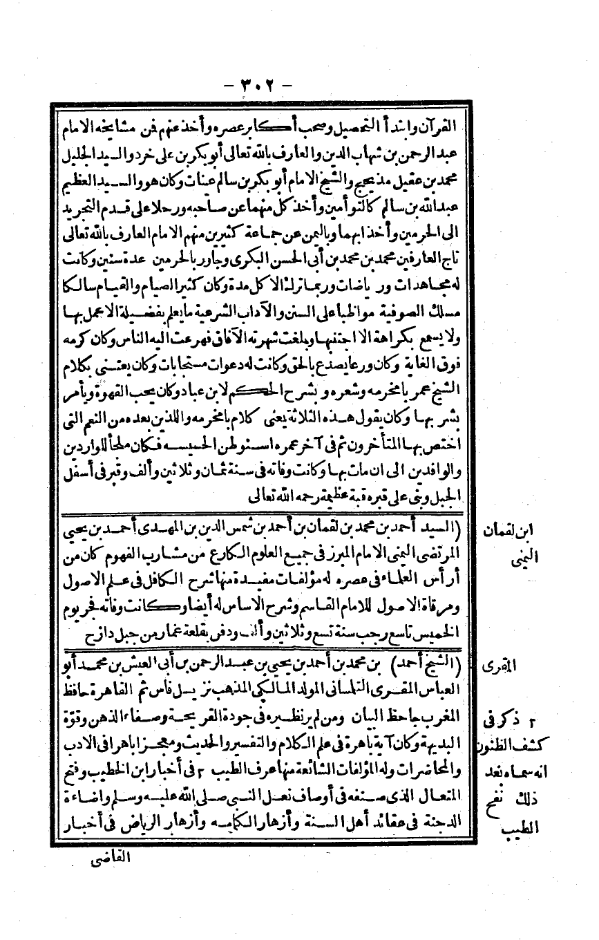 الشَّيْخ أَحْمد بن مُحَمَّد بن أَحْمد بن يحيى بن عبد الرَّحْمَن بن أبي الْعَيْش بن مُحَمَّد أَبُو الْعَبَّاس الْمقري التلمساني المولد الْمَالِكِي الْمَذْهَب نزيل فاس ثمَّ الْقَاهِرَة حَافظ الْمغرب جاحظ الْبَيَان وَمن لم ير نَظِيره فِي جودة القريحة وصفاء الذِّهْن وَقُوَّة البديهة وَكَانَ آيَة باهرة فِي علم الْكَلَام وَالتَّفْسِير والْحَدِيث ومعحزاً باهراً فِي الْأَدَب والمحاضرات وَله المؤلفات الشائعة مِنْهَا عرف الطّيب فِي أَخْبَار ابْن الْخَطِيب وَفتح المتعال الَّذِي صنفه فِي أَوْصَاف نعل النَّبِي