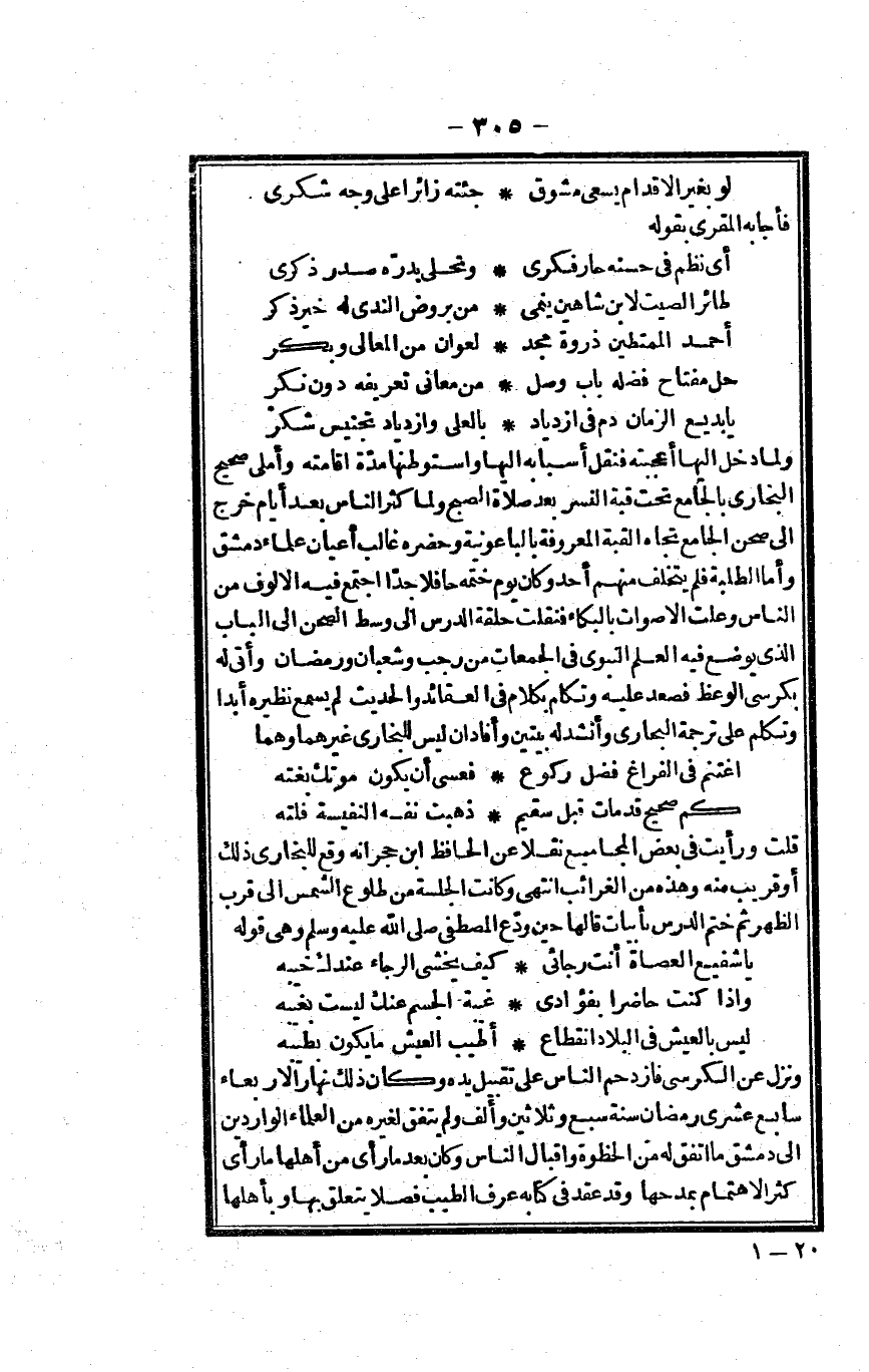 وَلما دخل إِلَيْهَا أَعْجَبته فَنقل أَسبَابه إِلَيْهَا واستوطنها مُدَّة إِقَامَته وأملى صَحِيح البُخَارِيّ بالجامع تَحت قبَّة النسْر بعد صَلَاة الصُّبْح وَلما كثر النَّاس بعد أَيَّام خرج إِلَى صحن الْجَامِع تجاه الْقبَّة الْمَعْرُوفَة بالباعونية وحضره غَالب أَعْيَان عُلَمَاء دمشق وَأما الطّلبَة فَلم يتَخَلَّف مِنْهُم أحد وَكَانَ يَوْم خَتمه حافلاً جدا اجْتمع فِيهِ الألوف من النَّاس وعلت الْأَصْوَات بالبكاء فنقلت حَلقَة الدَّرْس إِلَى وسط الصحن إِلَى الْبَاب الَّذِي يوضع فِيهِ الْعلم النَّبَوِيّ فِي الْجُمُعَات من رَجَب وَشَعْبَان ورمضان وأتى لَهُ بكرسي الْوَعْظ فَصَعدَ عَلَيْهِ وَتكلم بِكَلَام فِي العقائد والْحَدِيث لم يسمع نَظِيره أبدا وَتكلم على تَرْجَمَة البُخَارِيّ وَأنْشد لَهُ بَيْتَيْنِ وَأفَاد أَن لَيْسَ للْبُخَارِيّ غَيرهمَا وهما
