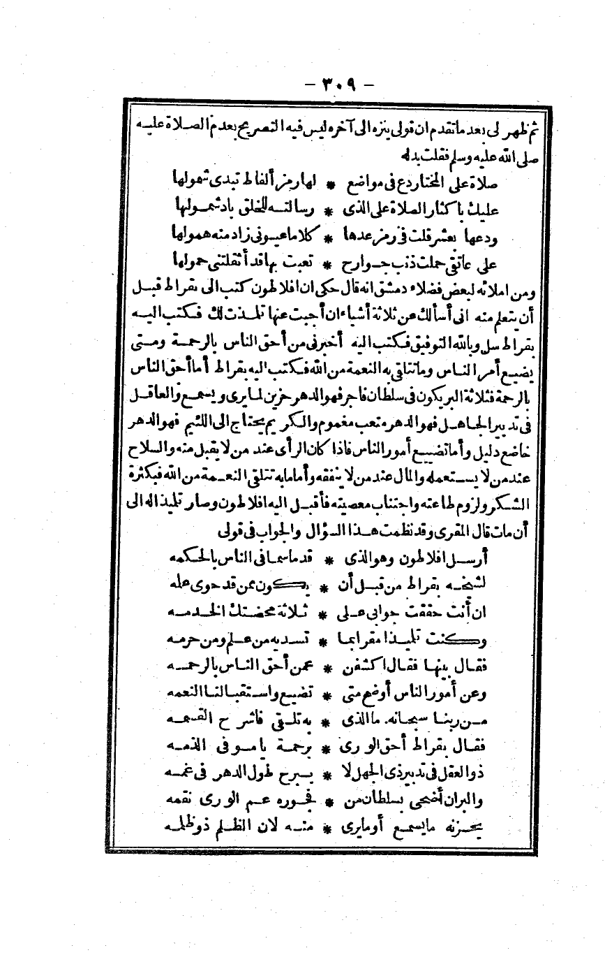 وَمن املائه لبَعض فضلاء دمشق أَنه قَالَ حكى أَن أفلاطون كتب إِلَى بقراط قبل أَن يتَعَلَّم مِنْهُ إِنِّي أَسأَلك عَن ثَلَاثَة أَشْيَاء أَن أجبْت عَنْهَا تلمذت لَك فَكتب إِلَيْهِ بقراط سل وَبِاللَّهِ التَّوْفِيق فَكتب إِلَيْهِ أَخْبرنِي من أَحَق النَّاس بِالرَّحْمَةِ وَمَتى يضيع أَمر النَّاس وَمَا تتلقى بِهِ النِّعْمَة من الله فَكتب إِلَيْهِ بقراط أما أَحَق النَّاس بِالرَّحْمَةِ فَثَلَاثَة البريكون فِي سُلْطَان فَاجر فَهُوَ الدَّهْر حَزِين لما يرى وَيسمع والعاقل فِي تَدْبِير الْجَاهِل فَهُوَ الدَّهْر مُتْعب مغموم والكريم يحْتَاج إِلَى اللَّئِيم فَهُوَ الدَّهْر خاضع دَلِيل وَأما تَضْييع أُمُور النَّاس فَإِذا كَانَ الرَّأْي عِنْد من لَا يقبل مِنْهُ وَالسِّلَاح عِنْد من لَا يَسْتَعْمِلهُ وَالْمَال عِنْد من لَا يُنْفِقهُ وَأما مَا بِهِ تتلقى النِّعْمَة من الله فبكثرة الشُّكْر وَلُزُوم طَاعَته وَاجْتنَاب مَعْصِيَته فَأقبل إِلَيْهِ أفلاطون وَصَارَ تلميذا لَهُ إِلَى أَن مَاتَ قَالَ الْمقري وَقد نظمت هَذَا السُّؤَال وَالْجَوَاب فِي قولي