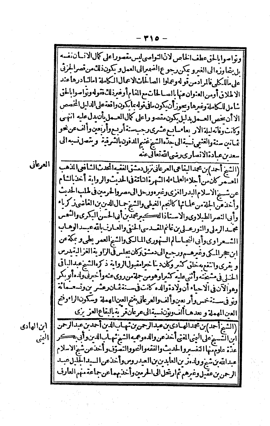 الشَّيْخ أَحْمد بن مُحَمَّد البقاعي العرعاني نزيل دمشق الْفَقِيه الْمُحدث الشَّافِعِي الْمَذْهَب المعمر كَانَ من أجلاء الْعلمَاء لَهُ الشُّهْرَة التَّامَّة فِي الحَدِيث وَالرِّوَايَة أَخذ بِالشَّام عَن شيخ الْإِسْلَام الْبَدْر الْغَزِّي وَغَيره ورحل إِلَى مصر والحرمين فِي طلب الحَدِيث وَأخذ عَن الجلة من علمائها كالنجم الغيطي وَالشَّيْخ جمال الدّين بن القَاضِي زَكَرِيَّاء وَأبي النَّصْر الطبلاوي والاستاذ الْكَبِير مُحَمَّد بن أبي الْحسن الْبكْرِيّ وَالشَّمْس مُحَمَّد الرَّمْلِيّ والنور عَليّ بن غَانِم الْمَقْدِسِي الْحَنَفِيّ والعارف بِاللَّه عبد الْوَهَّاب الشعراوي وَأبي النجا سَالم السنهوري الْمَالِكِي وَالشَّيْخ العمريطي وبمكة عَن ابْن حجر الْمَكِّيّ وَغَيرهم وَرجع إِلَى دمشق وَكَانَ يجلس فِي الزاوية الغزالية يدرس ويقري وانتفع بِهِ خلق كثير وَكَانَ دينا خيرا مَقْبُول الرِّوَايَة ذكره الشَّيْخ عبد الْبَاقِي الْحَنْبَلِيّ فِي مشيخته وَأثْنى عَلَيْهِ كثيرا وَهُوَ من جملَة من روى عَنهُ وَأَخْبرنِي وَلَده أَبُو بكر وَهُوَ الْآن فِي الاحياء أَن ولادَة وَالِده كَانَت فِي سنة ثَمَان وَعشْرين وَتِسْعمِائَة وَتُوفِّي فِي سنة خمس وَأَرْبَعين وَألف والعرعاني بِفَتْح الْعين الْمُهْملَة وَسُكُون الرَّاء وَفتح الْعين الْمُهْملَة وَبعدهَا ألف وَنون نِسْبَة إِلَى عرعان قَرْيَة بالبقاع العزيزي