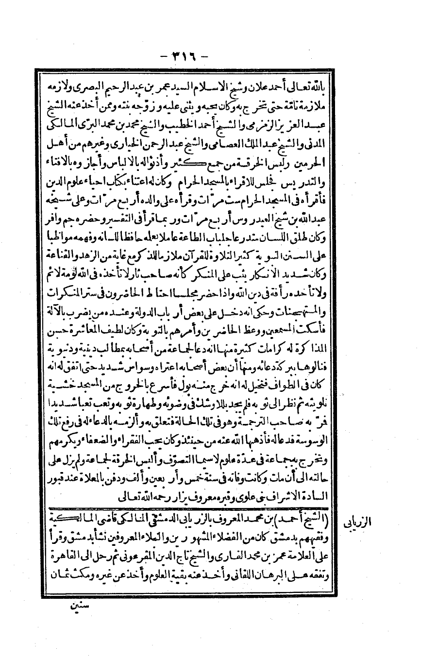 بِاللَّه تَعَالَى أَحْمد عَلان وَشَيخ الاسلام السَّيِّد عمر بن عبد الرَّحِيم الْبَصْرِيّ ولازمه مُلَازمَة تَامَّة حَتَّى تخرج بِهِ وَكَانَ يُحِبهُ ويثني عَلَيْهِ وزوجه بنته وَمِمَّنْ أَخذ عَنهُ الشَّيْخ عبد الْعَزِيز الزمزمي وَالشَّيْخ أَحْمد الْخَطِيب وَالشَّيْخ مُحَمَّد بن مُحَمَّد الْبري الْمَالِكِي الْمدنِي وَالشَّيْخ عبد الْملك العصامي وَالشَّيْخ عبد الرَّحْمَن الخياري وَغَيرهم من أهل الْحَرَمَيْنِ وَلبس الْخِرْقَة من جمع كثير وأذنوا لَهُ بالالباس وأجازوه بالافتاء والتدريس فَجَلَسَ للاقراء بِالْمَسْجِدِ الْحَرَام وَكَانَ لَهُ اعتناء بِكِتَاب احياء عُلُوم الدّين فَأَقْرَأهُ فِي الْمَسْجِد الْحَرَام سِتّ مَرَّات وقرأه على وَالِده أَربع مَرَّات على شَيْخه عبد الله بن شيخ العيدروس أَربع مَرَّات وَرُبمَا قَرَأَ فِي التَّفْسِير وحضره جم وافر وَكَانَ طلق اللِّسَان متدرعاً جِلْبَاب الطَّاعَة عَاملا بِعِلْمِهِ حَافِظًا لِلِسَانِهِ وفهمه مواظباً على السّنَن النَّبَوِيَّة كثير التِّلَاوَة لِلْقُرْآنِ ملازماً للذّكر مَعَ غَايَة من الزّهْد والقناعة وَكَانَ شَدِيد الانكار يثب على الْمُنكر كَأَنَّهُ صَاحب ثأر لَا تَأْخُذهُ فِي الله لومة لائم وَلَا تَأْخُذهُ رأفة فِي دين الله وَإِذا حضر مَجْلِسا احتاط الْحَاضِرُونَ فِي ستر الْمُنْكَرَات والمتهجنات وَحكي أَنه دخل على بعض أَرْبَاب الدولة وَعِنْده من يضْرب بالآلة فأسكت المسمعين وَوعظ الْحَاضِرين وَأمرهمْ بِالتَّوْبَةِ وَكَانَ لطيف المعاشرة حسن المذاكرة لَهُ كرامات كَثِيرَة مِنْهَا أَنه دَعَا لجَماعَة من أَصْحَابه بمطالب دينية ودنيوية فنالوها ببركة دُعَائِهِ وَمِنْهَا أَن بعض أَصْحَابه اعتراه وسواس شديدحتى اتّفق لَهُ أَنه كَانَ فِي الطّواف فتخيل لَهُ أَنه خرج مِنْهُ بَوْل فأسرع بِالْخرُوجِ من الْمَسْجِد خشيَة تلويثه ثمَّ نظر إِلَى ثَوْبه فَلم يجد بللاً وَشك فِي وضوئِهِ وطهارة ثَوْبه وتعب تعباً شَدِيدا فَمر بِهِ صَاحب التَّرْجَمَة وَهُوَ فِي تِلْكَ الْحَالة فتلعق بِهِ وألزمه بِالدُّعَاءِ لَهُ فِي رفع تِلْكَ الوسوسة فَدَعَا لَهُ فأذهبها الله عَنهُ من حِينَئِذٍ وَكَانَ يحب الْفُقَرَاء والضعفاء ويكرمهم وَتخرج بِهِ جمَاعَة فِي عدَّة عُلُوم لَا سِيمَا التصوف وألبس الْخِرْقَة لجَماعَة وَلم يزل على حَالَته إِلَى أَن مَاتَ وَكَانَت وَفَاته فِي سنة خمس وَأَرْبَعين وَألف وَدفن بالمعلاة عِنْد قُبُور السَّادة الْأَشْرَاف بني علوي وقبره مَعْرُوف يزار رَحمَه الله تَعَالَى