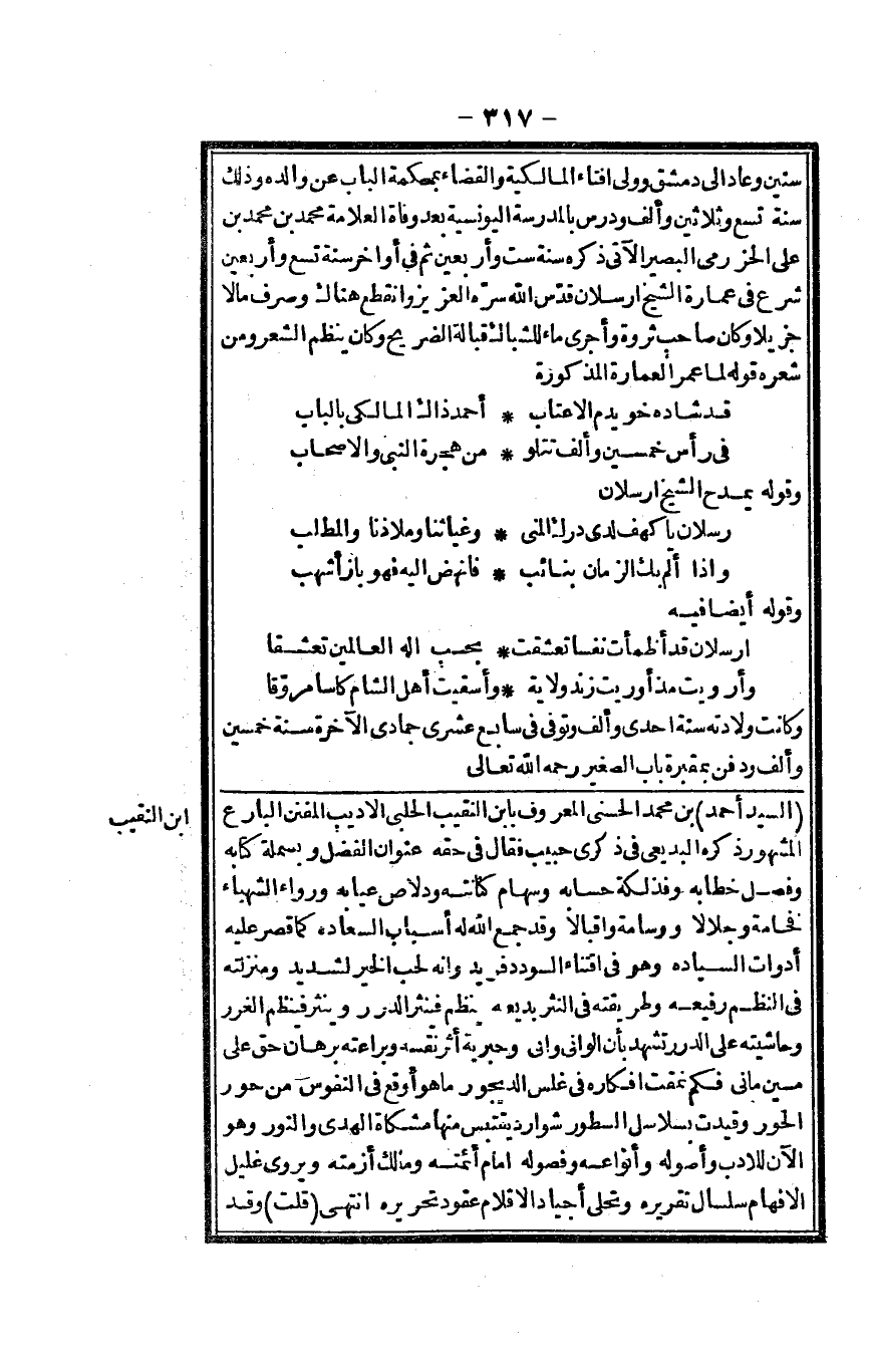 سِنِين وَعَاد إِلَى دمشق وَولي إِفْتَاء الْمَالِكِيَّة وَالْقَضَاء بمحكمة الْبَاب عَن وَالِده وَذَلِكَ سنة تسع وَثَلَاثِينَ وَألف ودرس بِالْمَدْرَسَةِ اليونسية بعد وَفَاة الْعَلامَة مُحَمَّد بن مُحَمَّد بن عَليّ الحزرمي الْبَصِير الْآتِي ذكره سنة سِتّ وَأَرْبَعين ثمَّ فِي أَوَاخِر سنة تسع وَأَرْبَعين شرع فِي عمَارَة الشَّيْخ أرسلان قدس الله سره الْعَزِيز وَانْقطع هُنَاكَ وَصرف مَالا جزيلاً وَكَانَ صَاحب ثروة وأجرى مَاء للشباك قبالة الضريح وَكَانَ ينظم الشّعْر وَمن شعره قَوْله لما عمر الْعِمَارَة الْمَذْكُورَة
