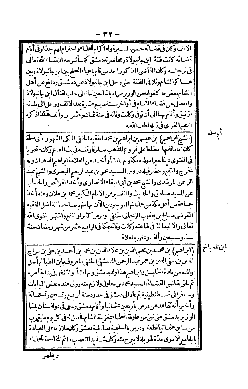 إِبْرَاهِيم بن مُحَمَّد بن محيي الدّين بن عَلَاء الدّين بن مُحَمَّد بن أَحْمد بن عَليّ بن سراج الدّين بن صفي الدّين بن عمر عبد الرَّحْمَن الدِّمَشْقِي الْحَنَفِيّ الْمَعْرُوف بِابْن الطباخ أصل وَالِده من بَلْدَة الْخَلِيل وَإِبْرَاهِيم هَذَا ولد بِدِمَشْق وَبهَا نَشأ واشتغل فِي بداية أمره ثمَّ لحق بقاضي الْقُضَاة السَّيِّد مُحَمَّد بن مَعْلُول ولازم مِنْهُ وَولى عِنْده بعض النيابات وسافر إِلَى قسطنطينية ثمَّ عَاد إِلَى دمشق فِي حُدُود سنة أَربع وَتِسْعين وَتِسْعمِائَة وَأخْبر بِأَنَّهُ تقاعد عَن درس بِأَرْبَعِينَ عثمانيا وَأقَام بِدِمَشْق وسعى فِي دولة سِنَان باشا الْوَزير بِدِمَشْق على شَيْء من علوفة الْعلمَاء بخزينة الشَّام فَحصل لَهُ فِي كل يَوْم مَا يقرب من سِتِّينَ عثمانيا قِطْعَة ودرس بالسليمية بصالحية دمشق وَكَانَ ملازما على الْعِبَادَة بالجامع الْأمَوِي مُدَّة طَوِيلَة لَا يبرح مِنْهُ وَكَانَ شَدِيد التعصب دَائِم المخاطبة للْعُلَمَاء