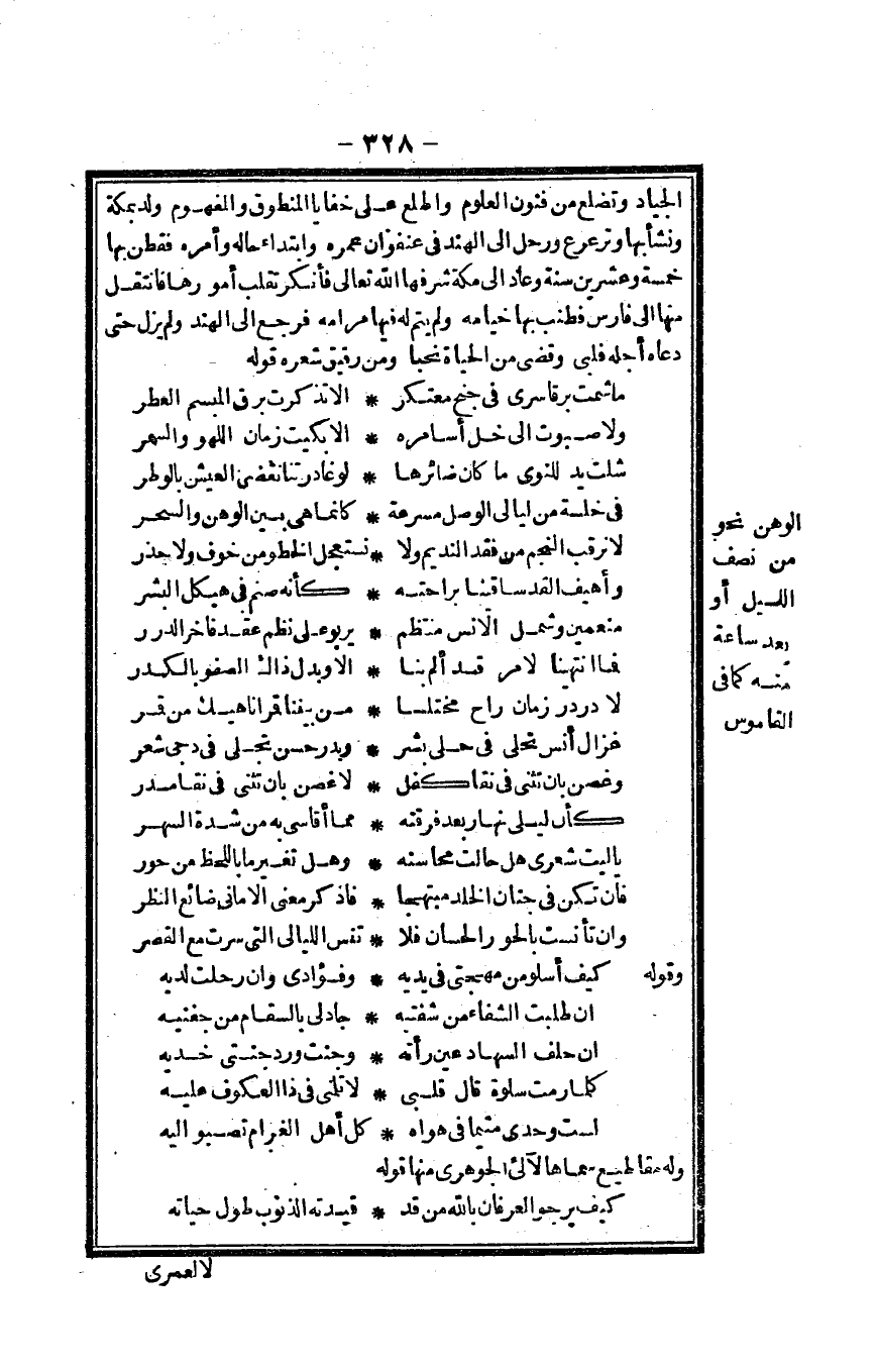 الْجِيَاد وتضلع من فنون الْعُلُوم واطلع على خفايا الْمَنْطُوق وَالْمَفْهُوم ولد بِمَكَّة وَنَشَأ بهَا وترعرع ورحل إِلَى الْهِنْد فِي عنفوان عمره وَابْتِدَاء حَاله وَأمره فقطن بهَا خَمْسَة وَعشْرين سنة وَعَاد إِلَى مَكَّة شرفها الله تَعَالَى فَأنْكر تقلب أمورها فانتقل مِنْهَا إِلَى فَارس فطنب بهَا خيامه وَلم يتم لَهُ فِيهَا مرامه فَرجع إِلَى الْهِنْد وَلم يزل حَتَّى دَعَاهُ أَجله فلبى وَقضى من الْحَيَاة نحبا وَمن رَقِيق شعره قَوْله