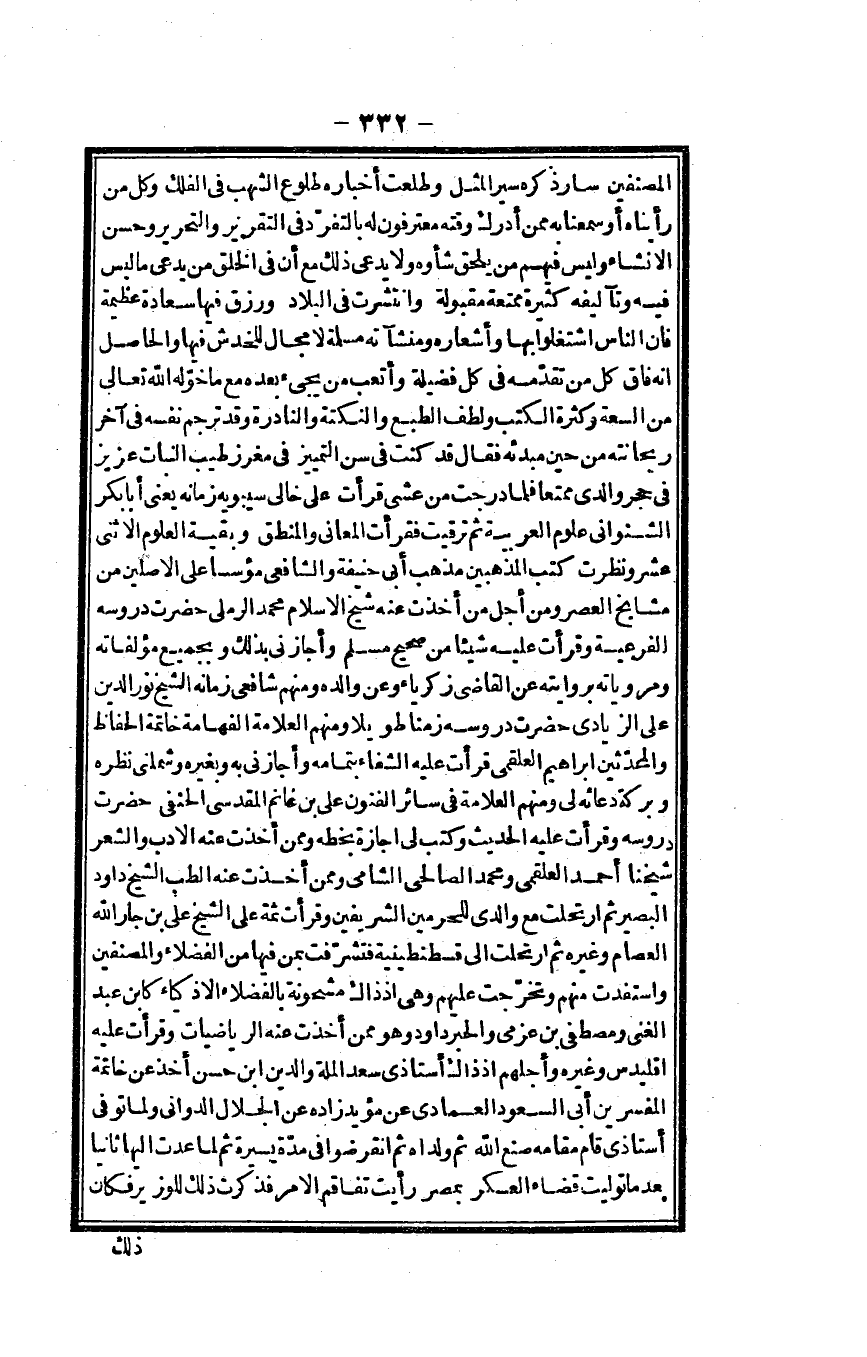 المصنفين سَار ذكره سير الْمثل وطلعت أخباره وطلوع الشهب فِي الْفلك وكل من رَأَيْنَاهُ أَو سمعنَا بِهِ مِمَّن أدْرك وقته معترفون لَهُ بالتفرد فِي التَّقْرِير والتحرير وَحسن الْإِنْشَاء وَلَيْسَ فيهم من يلْحق شأوه وَلَا يَدعِي ذَلِك مَعَ أَن فِي الْخلق من يدعى مَا لَيْسَ فِيهِ وتآليفه كَثِيرَة ممتعة مَقْبُولَة وانتشرت فِي الْبِلَاد وزرق فِيهَا سَعَادَة عَظِيمَة فَإِن النَّاس اشتغلوا بهَا وأشعاره ومنشآته مسلمة لَا مجَال للخدش فِيهَا وَالْحَاصِل أَنه فاق كل من تقدمه فِي كل فَضِيلَة وأتعب من يَجِيء بعده مَعَ مَا خوله الله تَعَالَى من السعَة وَكَثْرَة الْكتب ولطف الطَّبْع والنكتة والنادرة وَقد ترْجم نَفسه فِي آخر ريحانته من حِين مبدئه فَقَالَ قد كنت فِي سنّ التَّمْيِيز فِي مغرز طيب النَّبَات عَزِيز فِي حجر وَالِدي ممتعا فَلَمَّا درجت من عشى قَرَأت على خَالِي سِيبَوَيْهٍ زَمَانه يَعْنِي أَبَا بكر الشنواني عُلُوم الْعَرَبيَّة ثمَّ ترقيت فَقَرَأت الْمعَانِي والمنطق وَبَقِيَّة الْعُلُوم الاثْنَي عشر وتظرت كتب المذهبين مَذْهَب أبي حنيفَة وَالشَّافِعِيّ مؤسسا على الْأَصْلَيْنِ من مَشَايِخ الْعَصْر وَمن أجل من أخذت عَنهُ شيخ الْإِسْلَام مُحَمَّد الرَّمْلِيّ حضرت دروسه الفرعية وقرأت عَلَيْهِ شَيْئا من صَحِيح مُسلم وأجازني بذلك وبجميع مؤلفاته ومروياته بروايته عَن القَاضِي زَكَرِيَّاء عَن وَالِده مِنْهُم شَافِعِيّ زَمَانه الشَّيْخ نور الدّين على الزيَادي حضرت دروسه زَمنا طَويلا وَمِنْهُم الْعَلامَة الفهامة خَاتِمَة الْحفاظ والمحدثين إِبْرَاهِيم العلقمي قَرَأت عَلَيْهِ الشِّفَاء بِتَمَامِهِ وأجازني بِهِ وَبِغَيْرِهِ وشملني نظره وبركة دُعَائِهِ لي وَمِنْهُم الْعَلامَة فِي سَائِر الْفُنُون عَليّ بن غَانِم الْمَقْدِسِي الْحَنَفِيّ حضرت دروسه وقرأت عَلَيْهِ الحَدِيث وَكتب لي إجَازَة بِخَطِّهِ وَمِمَّنْ أخذت عَنهُ الْأَدَب وَالشعر شَيخنَا أَحْمد العلقمي وَمُحَمّد الصَّالِحِي الشَّامي وَمِمَّنْ أخذت عَنهُ الطِّبّ الشَّيْخ دَاوُد الْبَصِير ثمَّ ارتحلت مَعَ وَالِدي للحرمين الشريفين وقرأت ثمَّة على الشَّيْخ عَليّ بن جَار الله العصام وَغَيره ثمَّ ارتحلت مَعَ وَالِدي للحرمين الشريفين وقرأت ثمَّة على الشَّيْخ عَليّ بن جَار الله العصام وَغَيره ثمَّ ارتحلت إِلَى قسطنطينية فتشرفت بِمن فِيهَا من الْفُضَلَاء والمصنفين واستفدت مِنْهُم وتخرجت عَلَيْهِم وَهِي إِذْ ذَاك مشحونة بالفضلاء الأذكياء كَابْن عبد الْغَنِيّ ومصطفى بن عزمي والحبر دَاوُد وَهُوَ مِمَّن أخذت عَنهُ الرياضيات وقرأت عَلَيْهِ اقليدس وَغَيره وأجلهم إِذْ ذَاك أستاذي سعد الْملَّة وَالدّين ابْن حسن أَخذ عَن خَاتِمَة الْمُفَسّرين أبي السُّعُود الْعِمَادِيّ عَن مؤيد زَاده عَن الْجلَال الدواني وَلما توفّي أستاذي قَامَ مقَامه صنع الله ثمَّ ولداه ثمَّ انقرضوا فِي مُدَّة يسيرَة ثمَّ لما عدت إِلَيْهَا ثَانِيًا بَعْدَمَا توليت قَضَاء الْعَسْكَر بِمصْر رَأَيْت تفاقم الْأَمر فَذكرت ذَلِك للوزير فَكَانَ