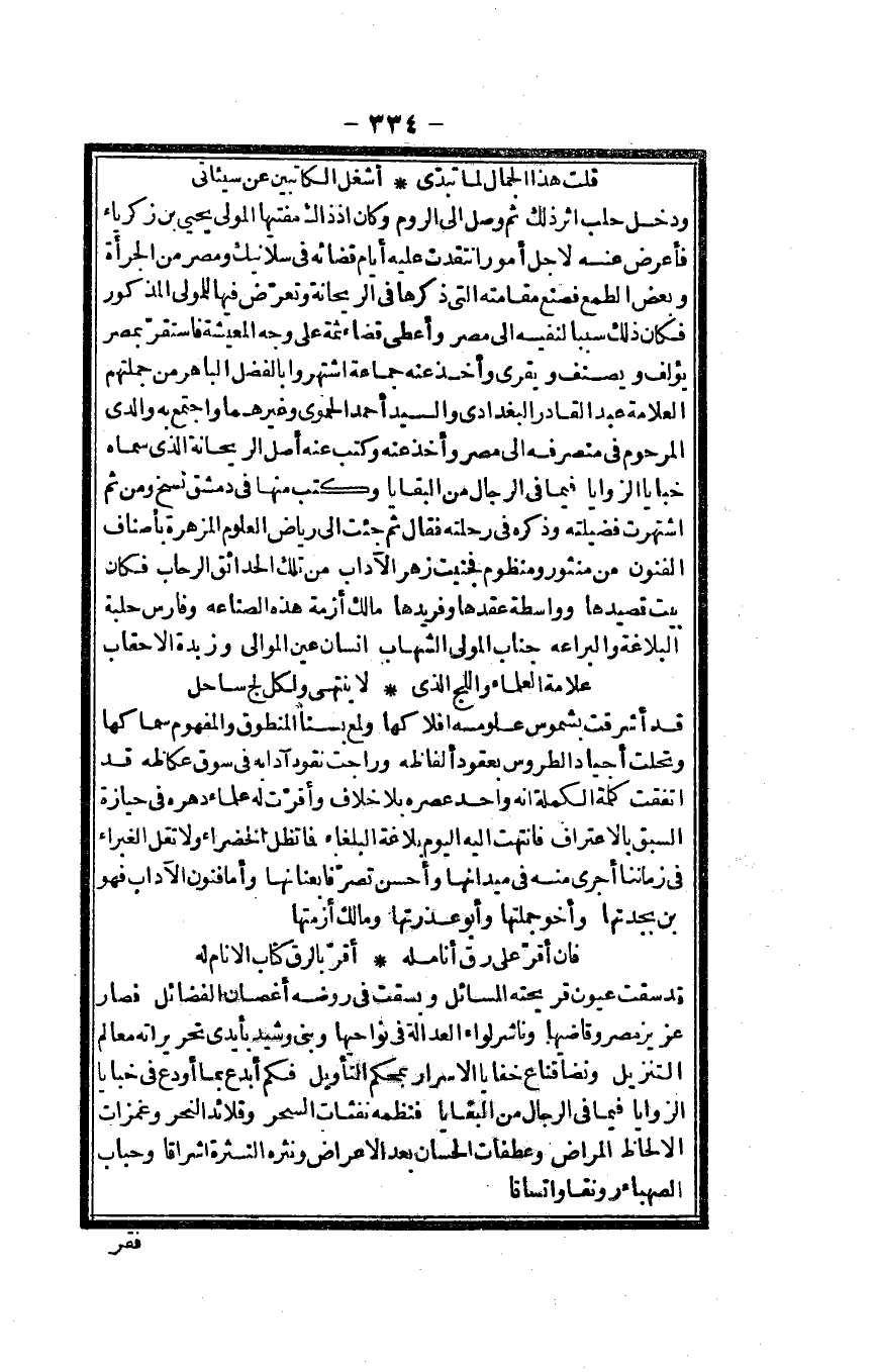قد أشرقت بشموس علومه أفلاكها ولمع بسنا الْمَنْطُوق وَالْمَفْهُوم سماكها وتحلت أجياد الطروس بعقود أَلْفَاظه وراجت نقود آدابه فِي سوق عكاظه قد اتّفقت كلمة الكملة أَنه وَاحِد عصره بِلَا خلاف وأقرت لَهُ عُلَمَاء دهره فِي حِيَازَة السَّبق بالاعتراف فانتهت إِلَيْهِ الْيَوْم بلاغة البلغاء فَمَا تظل الخضراء وَلَا تقل الغبراء فِي زَمَاننَا أجْرى مِنْهُ فِي ميدانها وَأحسن تَصرفا بعنانها وَأما فنون الْآدَاب فَهُوَ بن بجدتها وأخو جُمْلَتهَا وَأَبُو عذرتها وَمَالك أزمتها