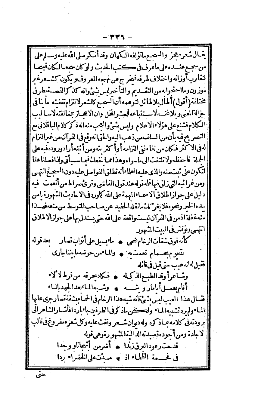 على من سجع عِنْده على مَا عرف فِي كتب الحَدِيث وَلَو كَانَ سجعاً لَكَانَ قبيحاً لتقارب أوزانه وَاخْتِلَاف طرقه فَيخرج عَن نهجه الْمَعْرُوف وَيكون كشعر غير مَوْزُون وَمَا احْتَجُّوا بِهِ من التَّقْدِيم وَالتَّأْخِير لَيْسَ بِشَيْء وَأَنه كذكر الْقِصَّة بطرق مُخْتَلفَة أَقُول أَطَالَ بِلَا طائل لتوهمه أَن السجع كالشعر لالتزام تقفيته مَا يُنَافِي جزالة الْمَعْنى وبلاغته لاستتباعه للحشو والمخل وَأَن الإعجاز بمخالفته لأساليب الْكَلَام فشنع على هَؤُلَاءِ الْأَعْلَام وَلَيْسَ بِشَيْء وَالْعجب مِنْهُ أَنه ذكر كَلَام الباقلاني مَعَ التَّصْرِيح فِيهِ بِأَن من السّلف من ذهب إِلَيْهِ وَالْحق أَنه وَقع فِي الْقُرْآن من غير الْتِزَام لَهُ فِي الْأَكْثَر فَكَانَ من نَفَاهُ نفي الْتِزَامه أَو أكثريته وَمن أثْبته أَرَادَ وُرُوده فِيهِ على الْجُمْلَة فاحفظه وَلَا تلْتَفت إِلَى مَا سواهُ وَهَذَا مِمَّا ينفعك فِيمَا سَيَأْتِي وَلذَا فصلنا هُنَا لتَكون على ثَبت مِنْهُ وَالَّذِي عَلَيْهِ الْعلمَاء أَنه تطلق الفواصل عَلَيْهِ دون السجع انْتهى وَمن غَرَائِبه الَّتِي زلق فِيهَا قلمه قَوْله عِنْد قَول القَاضِي وقرىء صِرَاط من أَنْعَمت فِيهِ دَلِيل على جَوَاز إِطْلَاق الْأَسْمَاء المبهمة على الله كَمَا ورد فِي الْأَحَادِيث الْمَشْهُورَة يَا من بِيَدِهِ الْخَيْر وَنَحْوه فَلَا يغرنك مَا نَقله الْحَفِيد عَن صَاحب الْمُتَوَسّط من مَنعه فَهَذَا مِنْهُ غَفلَة إِذْ من فِي الْقُرْآن لَيست وَاقعَة على الله حَتَّى يسْتَدلّ بهَا على جَوَاز الاطلاق انْتهى ونوقش فِي الْبَيْت الْمَشْهُور