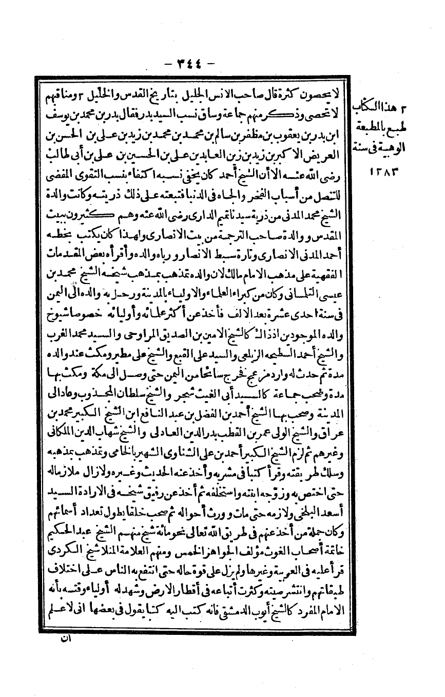 لَا يُحصونَ كَثْرَة قَالَ صَاحب الْإِنْس الْجَلِيل بتاريخ الْقُدس والخليل ومناقبهم لَا تحصى وَذكر مِنْهُم جمَاعَة وسَاق نسب السَّيِّد بدر فَقَالَ بدر بن مُحَمَّد بن يُوسُف ابْن بدر بن يَعْقُوب بن مظفر بن سَالم بن مُحَمَّد بن مُحَمَّد بن زيد بن عَليّ بن الْحسن بن العريض الْأَكْبَر بن زيد بن زين العابدين بن عَليّ بن الْحُسَيْن بن عَليّ بن أبي طَالب رَضِي الله عَنهُ إِلَّا أَن الشَّيْخ أَحْمد كَانَ يخفي نسبه اكْتِفَاء بِنسَب التَّقْوَى المفضي للتنصل من أَسبَاب الْفَخر والجاه فِي الدُّنْيَا فتبعته على ذَلِك ذُريَّته وَكَانَت وَالِدَة الشَّيْخ مُحَمَّد الْمدنِي من ذُرِّيَّة سيدنَا تَمِيم الدَّارِيّ رَضِي الله عَنهُ وهم كَثِيرُونَ بِبَيْت الْمُقَدّس ووالدة صَاحب التَّرْجَمَة من بَيت الْأنْصَارِيّ وَلِهَذَا كَانَ يكْتب بِخَطِّهِ أَحْمد الْمدنِي الْأنْصَارِيّ وَتارَة سبط الْأَنْصَار ورباه وَالِده وَأَقَرَّاهُ بعض الْمُقدمَات الْفِقْهِيَّة على مَذْهَب الإِمَام مَالك لِأَن وَالِده تمذهب بِمذهب شَيْخه الشَّيْخ مُحَمَّد بن عِيسَى التلمساني وَكَانَ من كبراء الْعلمَاء والأولياء بِالْمَدِينَةِ ورحل بِهِ وَالِده إِلَى الْيمن فِي سنة إِحْدَى عشرَة بعد الْألف فَأخذ عَن أَكثر علمائه وأوليائه خُصُوصا شُيُوخ وَالِده الْمَوْجُودين إِذْ ذَاك كالشيخ الْأمين بن الصّديق المراوحي وَالسَّيِّد مُحَمَّد الغرب وَالشَّيْخ أَحْمد السطيحة الزَّيْلَعِيّ وَالسَّيِّد عَليّ القبع وَالشَّيْخ عَليّ مطير وَمكث عِنْد وَالِده مُدَّة ثمَّ حدث لَهُ وَارِد مزعج فَخرج سائحاً من الْيمن حَتَّى وصل إِلَى مَكَّة وَمكث بهَا مُدَّة وَصَحب جمَاعَة كالسيد أبي الْغَيْث شجر وَالشَّيْخ سُلْطَان المجذوب وَعَاد إِلَى الْمَدِينَة وَصَحب بهَا الشَّيْخ أَحْمد بن الْفضل بن عبد النافع ابْن الشَّيْخ الْكَبِير مُحَمَّد بن عراق وَالشَّيْخ الْوَلِيّ عمر بن القطب بدر الدّين العادلي وَالشَّيْخ شهَاب الدّين الملكاني وَغَيرهم ثمَّ لزم الشَّيْخ الْكَبِير أَحْمد بن عَليّ الشناوي الشهير بالخامي وتمذهب بمذهبه وسلك طَرِيقَته وَقَرَأَ كتبا فِي مشربه وَأخذ عَنهُ الحَدِيث وَغَيره وَلَا زَالَ ملازماً لَهُ حَتَّى اخْتصَّ بِهِ وزوجه ابْنَته واستخلفه ثمَّ أَخذ عَن رَفِيق شَيْخه فِي الْإِرَادَة السَّيِّد أسعد الْبَلْخِي ولازمه حَتَّى مَاتَ وَورث أَحْوَاله ثمَّ صحب خلقا يطول تعداد أسمائهم وَكَانَ جملَة من أَخذ عَنْهُم فِي طَرِيق الله تَعَالَى نَحْو مائَة شيخ مِنْهُم الشَّيْخ عبد الْحَكِيم خَاتِمَة أَصْحَاب الْغَوْث مؤلف الْجَوَاهِر الْخمس وَمِنْهُم الْعَلامَة المنلا شيخ الْكرْدِي قَرَأَ عَلَيْهِ فِي الْعَرَبيَّة وَغَيرهَا وَلم يزل على قُوَّة حَاله حَتَّى انْتفع بِهِ النَّاس على اخْتِلَاف طبقاتهم وانتشر صيته وَكَثُرت أَتْبَاعه فِي أقطار الأَرْض وَشهد لَهُ أَوْلِيَاء وقته بِأَنَّهُ الإِمَام الْمُفْرد كالشيخ أَيُّوب الدِّمَشْقِي فَإِنَّهُ كتب إِلَيْهِ كتبا يَقُول فِي بَعْضهَا إِنِّي لأعْلم