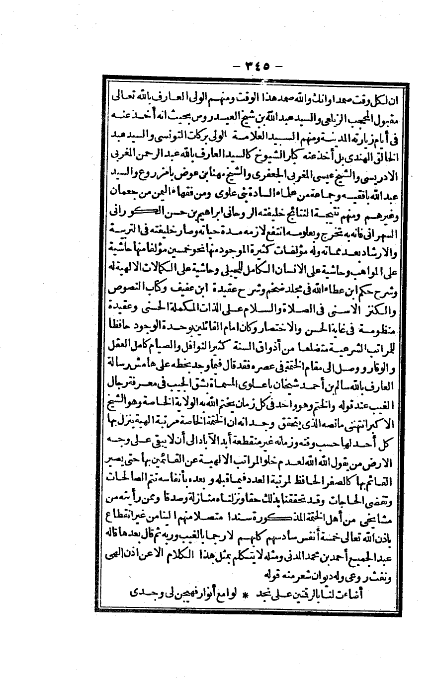أَن لكل وَقت صَمد وَأَنَّك وَالله صَمد هَذَا الْوَقْت وَمِنْهُم الْوَلِيّ الْعَارِف بِاللَّه تَعَالَى مَقْبُول المحجب الزَّيْلَعِيّ وَالسَّيِّد عبد الله بن شيخ العيدروس بِحَيْثُ أَنه أَخذ عَنهُ فِي أَيَّام زيارته الْمَدِينَة وَمِنْهُم السَّيِّد الْعَلامَة الْوَلِيّ بَرَكَات التّونسِيّ وَالسَّيِّد عبد الْخَالِق الْهِنْدِيّ بل أَخذ عَنهُ كبار الشُّيُوخ كالسيد الْعَارِف بِاللَّه عبد الرَّحْمَن المغربي الإدريسي وَالشَّيْخ عِيسَى المغربي الْجَعْفَرِي وَالشَّيْخ مهنا بن عوض بامزروع وَالسَّيِّد عبد الله بافقيه وَجَمَاعَة من عُلَمَاء السَّادة بني علوي وَمن فُقَهَاء الْيمن من جعمان وَغَيرهم وَمِنْهُم نتيجة النتائج خَلِيفَته الروحاني إِبْرَاهِيم بن حسن الكوراني السهراني فَإِنَّهُ بِهِ تخرج وبعلومه انْتفع لَازمه مُدَّة حَيَاته وَصَارَ خَلِيفَته فِي التربية والإرشاد بعد مماته وَله مؤلفات كَثِيرَة الْمَوْجُود مِنْهَا نَحْو خمسين مؤلفاً مِنْهَا حَاشِيَة على الْمَوَاهِب وحاشية على الْإِنْسَان الْكَامِل للجيلي وحاشية على الكمالات الإلهية لَهُ وَشرح حكم ابْن عَطاء الله فِي مُجَلد ضخم وَشرح عقيدة ابْن عفيف وَكتاب النُّصُوص والكنز الْأَسْنَى فِي الصَّلَاة وَالسَّلَام على الذَّات المكملة الْحسنى وعقيدة منظومة فِي غَايَة الْحسن والاختصار وَكَانَ إِمَام الْقَائِلين بوحدة الْوُجُود حَافِظًا للمراتب الشَّرْعِيَّة متضلعاً من أذواق السّنة كثير النَّوَافِل وَالصِّيَام كَامِل الْعقل وَالْوَقار وَوصل إِلَى مقَام الختمة فِي عصره فقد قَالَ فِيمَا وجد بِخَطِّهِ على هَامِش رِسَالَة الْعَارِف بِاللَّه سَالم بن أَحْمد شَيْخَانِ باعلوي الْمُسَمَّاة بشق الجيب فِي معرفَة رجال الْغَيْب عِنْد قَوْله والختم وَهُوَ وَاحِد فِي كل زمَان يخْتم الله بِهِ الْولَايَة الْخَاصَّة وَهُوَ الشَّيْخ الْأَكْبَر انْتهى مَا نَصه الَّذِي يتَحَقَّق وجدانه أَن الختمة الْخَاصَّة مرتبَة إلهية ينزل بهَا كل أحد لَهَا حسب وقته وزمانه غيرم منقطعه أَبَد الآباد إِلَى أَن لَا يبْقى على وَجه الأَرْض من يَقُول الله الله لعدم خلو الْمَرَاتِب الإلهية عَن القائمين بهَا حَتَّى يصير الْقَائِم بهَا كالصفر الْحَافِظ لمرتبة الْعدَد فميا قبله وَبعده بأنفاسه تتمّ الصَّالِحَات وتقضى الْحَاجَات وَقد تحققنا بذلك حَقًا ونزلنا منازلة وصدقاً وَمِمَّنْ رَأَيْته من مشايخي من أهل الختمة الْمَذْكُورَة سنداً مُتَّصِلا مِنْهُم إِلَيْنَا من غير انْقِطَاع بِإِذن الله تَعَالَى خَمْسَة أنفس سادسهم كلبهم لَا رجماً بِالْغَيْبِ وربه ثمَّ قَالَ بعْدهَا قَالَه عبد الْجَمِيع أَحْمد بن مُحَمَّد الْمدنِي وَمثله لَا يتَكَلَّم بِمثل هَذَا الْكَلَام إِلَّا عَن إِذن إلهي وَنَفث روعي وَله ديوَان شعر مِنْهُ قَوْله