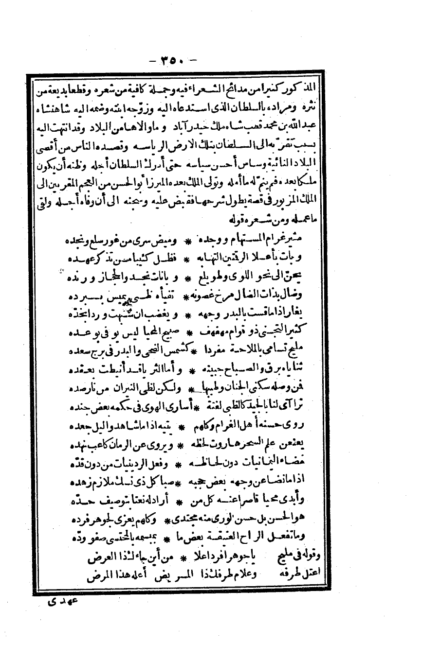 الْمَذْكُور كثيرا من مدائح الشُّعَرَاء فِيهِ وَجُمْلَة كَافِيَة من شعره وقطعا بديعة من نثره وَمرَاده بالسلطان الَّذِي استدعاه إِلَيْهِ وزوجه ابْنَته وضمه إِلَيْهِ شاهنشاه عبد الله بن مُحَمَّد قصب شاه ملك حيدر آباد وَمَا والاها من الْبِلَاد وَقد انْتَهَت إِلَيْهِ بِسَبَب تقربه إِلَى السُّلْطَان بِتِلْكَ الأَرْض الرياسة وقصده النَّاس من أقْصَى الْبِلَاد النائية وساس أحسن سياسة حَتَّى أدْرك السُّلْطَان أَجله وظنه أَن يكون ملكا بعده فَم ينم لَهُ مَا أمله وَتَوَلَّى الْملك بعده الميرز أَبُو الْحسن من الْعَجم المقربين إِلَى الْملك الْمَزْبُور فِي قصَّة يطول شرحها فَقبض عَلَيْهِ وسجنه إِلَى أَن وفاه أَجله وَلَقي مَا عمله وَمن شعره قَوْله