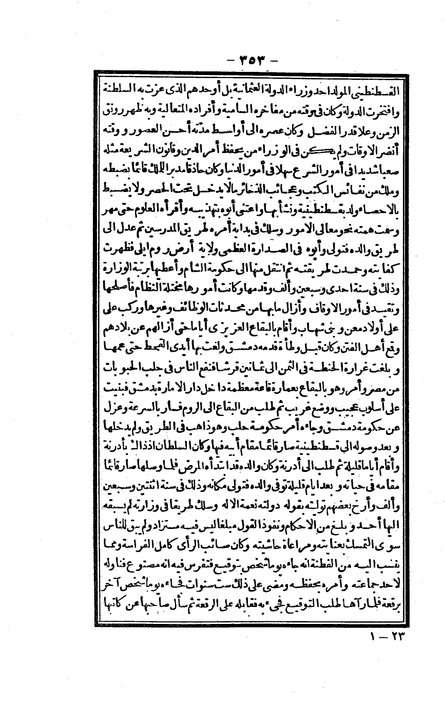القسطنطيني المولد أحد وزراء الدولة العثمانية بل أوحدهم الَّذِي عزت بِهِ السلطنة وافتخرت الدولة وَكَانَ فِي وقته من مفاخره السامية وأفراده المتعالية وَبِه ظهر رونق الزَّمن وَعلا قدر الْفضل وَكَانَ عصره إِلَى أواسط مدَّته أحسن العصور وقته أَنْضَرُ الْأَوْقَات وَلم يكن فِي الوزراء من يحفظ أَمر الدّين وقانون الشَّرِيعَة مثله صعباً شَدِيدا فِي أُمُور الشَّرْع سهلاً فِي أُمُور الدُّنْيَا وَكَانَ حاذقاً مُدبر للْملك قَائِما بضبطه وَملك من نفائس الْكتب وعجائب الذَّخَائِر مَا لَا يدْخل تَحت الْحصْر وَلَا يضْبط بالاحصاء ولد بقسطنطينية وَنَشَأ بهَا واعتنى أَبوهُ بتهذيبه وأقرأه الْعُلُوم حَتَّى مهر وسمت همته نَحْو معالي الْأُمُور وسلك فِي بداية أمره طَرِيق المدرسين ثمَّ عدل إِلَى طَرِيق وَالِده فَتَوَلّى وَأَبوهُ فِي الصدارة الْعُظْمَى ولَايَة أَرض روم ايلي فظهرت كِفَايَته وحمدت طَرِيقَته ثمَّ انْتقل مِنْهَا إِلَى حُكُومَة الشَّام وأعطيها برتبة الوزارة وَذَلِكَ فِي سنة إِحْدَى وَسبعين وَألف وقدمها وَكَانَت أمورها مختلة النظام فأصلها وتقيد فِي أُمُور الْأَوْقَاف وأزال مَا بهَا من محدثات الْوَظَائِف وَغَيرهَا وَركب على أَوْلَاد معن وَبني شهَاب وَأقَام بالبقاع العزيزي أَيَّامًا حَتَّى أزالهم عَن بِلَادهمْ وقمع أهل الْفِتَن وَكَانَ قبل وَطْأَة قدمه دمشق ولغت بهَا أَيدي الْقَحْط حَتَّى عَمها وَبَلغت غرارة الْحِنْطَة فِي الثّمن إِلَى ثَمَانِينَ قرشا فنفع النَّاس فِي جلب الحبوبات من مصر وَأمر هُوَ بالبقاع بعمارة قاعة معظمة دَاخل درا الْإِمَارَة بِدِمَشْق فبنيت على أسلوب عَجِيب وَوضع غَرِيب ثمَّ طلب من الْبِقَاع إِلَى الرّوم فَسَار بالسرعة وعزل عَن حُكُومَة دمشق وجاءه أَمر حُكُومَة حلب وَهُوَ ذَاهِب فِي الطَّرِيق وَلم يدخلهَا وَبعد وُصُوله إِلَى قسطنطينية صَار قَائِما مقَام أَبِيه فِيهَا وَكَانَ السُّلْطَان إِذْ ذَاك بأدرنة وَأقَام أَيَّامًا قَليلَة ثمَّ طلب إِلَى أدرنة وَكَانَ وَالِده قد ابتدأه الْمَرَض فَلَمَّا وَصلهَا صَار قَائِما مقَامه فِي حَيَاته وَبعد أَيَّام قَليلَة توفّي وَالِده فَتَوَلّى مَكَانَهُ وَذَلِكَ فِي سنة اثْنَتَيْنِ وَسبعين وَألف وأرخ بَعضهم تَوليته بقوله دولته نعْمَة الْإِلَه وسلك طَرِيقا فِي وزارته لم يسْبقهُ إِلَيْهَا أحد وَبلغ من الْأَحْكَام ونفوذ القَوْل مبلغا لَيْسَ فِيهِ مستزاد وَلم يبْق للنَّاس سوى التَّمَسُّك بعنايته ومراعاة حَاشِيَته وَكَانَ صائب الرَّأْي كَامِل الفراسة وَمِمَّا ينْسب إِلَيْهِ من الفطنة أَنه جَاءَهُ يَوْمًا شخص بتوقيع فتفرس فِيهِ أَنه مَصْنُوع فَنَاوَلَهُ لأحد جماعته وَأمره بحفظه وَمضى على ذَلِك سِتّ سنوات فَجَاءَهُ يَوْمًا شخص آخر برقعة فَلَمَّا رَآهَا طلب التوقيع فجيء بِهِ فقابله على الرقعة ثمَّ سَأَلَ صَاحبهَا عَن كاتبها