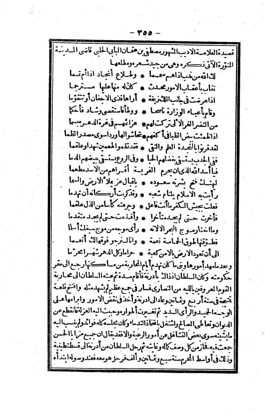 قصيدة الْعَلامَة الأديب الْمَشْهُور مصطفى بن عُثْمَان البابي الْحلَبِي قَاضِي الْمَدِينَة المنورة الْآتِي ذكره وَهِي من جيد شعره ومطلعها