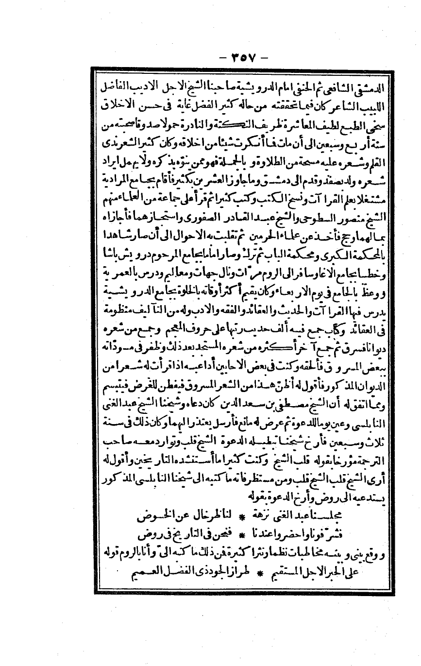 الدِّمَشْقِي الشَّافِعِي ثمَّ الْحَنَفِيّ إِمَام الدرويشية صاحبنا الشَّيْخ الْأَجَل الأديب الْفَاضِل اللبيب الشَّاعِر كَانَ فِيمَا تحققته من حَاله كثير الْفضل غَايَة فِي حسن الْأَخْلَاق سخي الطَّبْع لطيف المعاشرة ظريف النُّكْتَة والنادرة حمولاً صَدُوقًا صحبته من سنة أَربع وَسبعين إِلَى أَن مَاتَ فَمَا أنْكرت شَيْئا من أخلاقه وَكَانَ كثير الشّعْر ندي الْقَلَم وشعره عَلَيْهِ مسحة من الطلاوة وَبِالْجُمْلَةِ فَهُوَ مِمَّن يُنَوّه بِذكرِهِ وَلَا يهمل إِيرَاد شعره ولد بصفد وَقدم إِلَى دمشق وَمَا جَاوز الْعشْرين بِكَثِير فَأَقَامَ بِجَامِع المرادية مشتغلا بِعلم القراآت وَنسخ الْكتب وَكتب كثيرا ثمَّ قَرَأَ على جمَاعَة من الْعلمَاء مِنْهُم الشَّيْخ مَنْصُور السطوحي وَالشَّيْخ عبد الْقَادِر الصفوري واستجازهما فَأَجَازَهُ بمالهما وَحج فَأخذ عَن عُلَمَاء الْحَرَمَيْنِ ثمَّ تقلبت بِهِ الْأَحْوَال إِلَى أَن صَار شَاهدا بالمحكمة الْكُبْرَى ومحكمة الْبَاب ثمَّ ترك وَصَارَ إِمَامًا بِجَامِع المرحوم درويش باشا وخطيبا بِجَامِع الأغا وسافر إِلَى الرّوم مَرَّات ونال جِهَات ومعاليم ودرس بالعمرية وَوعظ بالجامع فِي يَوْم الاربعاء وَكَانَ يُقيم أَكثر أوقاته بالخلوة بِجَامِع الدرويشية يدرس فِيهَا القراآت والْحَدِيث والعقائد وَالْفِقْه وَالْأَدب وَله من التآليف منظومة فِي العقائد وَكتاب جمع فِيهِ ألف حَدِيث رتبها على حُرُوف المعجم وَجمع من شعره ديوانا فَسرق ثمَّ جمع آخر أَكْثَره من شعره المستجد بعد ذَلِك وظفر فِي مسوداته بِبَعْض الْمَسْرُوق فألحقه وَكنت فِي بعض الْأَحَايِين أداعبه إِذا قَرَأت لَهُ شعرًا من الدِّيوَان الْمَذْكُور فَأَقُول لَهُ أَظن هَذَا من الشّعْر الْمَسْرُوق فيفطن للغرض فيبتسم وَمِمَّا اتّفق لَهُ أَن الشَّيْخ مصطفى بن سعد الدّين كَانَ دعاءه وَشَيخنَا الشَّيْخ عبد الْغَنِيّ النابلسي وَعين يَوْمًا للدعوة ثمَّ عرض لَهُ مَانع فَأرْسل يعْتَذر إِلَيْهِمَا وَكَانَ ذَلِك فِي سنة ثَلَاث وَسبعين فأرخ شَيخنَا تبطيله الدعْوَة الشَّيْخ قلب وتوارد مَعَه صَاحب التَّرْجَمَة مؤرخاً بقوله قلب الشَّيْخ وَكنت كثيرا مَا استنشده التاريخين وَأَقُول لَهُ أرى الشَّيْخ قلب الشَّيْخ قلب وَمن مستظرفاته مَا كتبه إِلَى شَيخنَا النابلسي الْمَذْكُور يستدعيه إِلَى روض وأرخ الدعْوَة بقوله