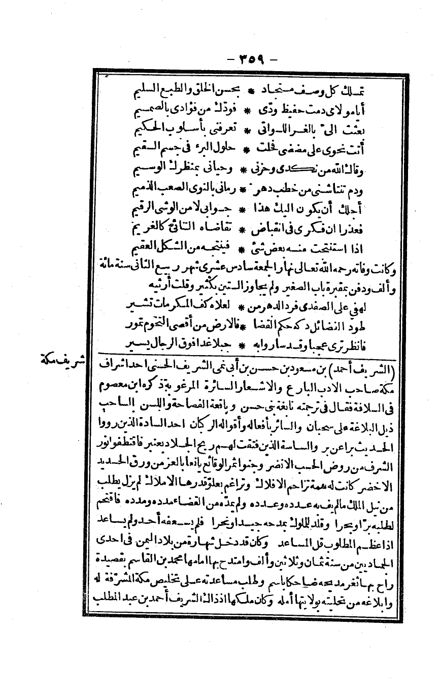 الشريف أَحْمد بن مَسْعُود بن حسن بن أبي نمى الشريف الحسني أحد أَشْرَاف مَكَّة صَاحب الْأَدَب البارع والأشعار السائرة المرغوبة ذكره ابْن مَعْصُوم فِي السلافة فَقَالَ فِي تَرْجَمته نَابِغَة بني حسن وباقعة الفصاحة واللسن الساحب ذيل البلاغة على سحبان والسائر بأفعاله وأقواله الركْبَان أحد السَّادة الَّذين رووا الحَدِيث برا عَن بر والساسة الَّذِي فتقت لَهُم ريح الجلاد بعنبر فاقتطفوا نور الشّرف من روض الْحبّ الأنضر وجنوا ثَمَر الوقائع يانعاً بالعز من ورق الْحَدِيد الْأَخْضَر كَانَت لَهُ همة تزاحم الأفلاك وتراغم بعلو قدرهَا الْأَمْلَاك لم يزل يطْلب من نيل الْملك مَا لم يَفِ بِهِ عدده وعدده وَلم يمده من الْقَضَاء مدده ومدده فاقتحم لطلبه برا وبحرا وقلد للملوك بمدحه جيدا ونحرا لم يسعفه أحد وَلم يساعد إِذا عظم الْمَطْلُوب قل المساعد وَكَانَ قد دخل شهارة من بِلَاد الْيمن فِي حدى الجماديين من سنة ثَمَان وَثَلَاثِينَ وَألف وامتدح بهَا إمامها مُحَمَّد بن الْقَاسِم بقصيدة رَاح بهَا ثغر مديحه ضَاحِكا باسم وَطلب مساعدته على تَخْلِيص مَكَّة المشرفة لَهُ وإبلاغه من تحليته بولايتها امله وَكَانَ ملكهَا إِذْ ذَاك الشريف أَحْمد بن عبد الْمطلب