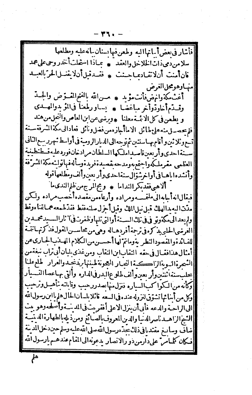 فَلم يحصل مِنْهُ على طائل إِلَّا مَا أجَازه من فضل ونائل فَعَاد إِلَى مَكَّة المشرفة سنة تسع وَثَلَاثِينَ وَأقَام بهَا سنتَيْن ثمَّ توجه إِلَى الديار الرومية فِي أواسط شهر ربيع الثَّانِي سنة إِحْدَى وَأَرْبَعين قَاصِدا ملكهَا السُّلْطَان مُرَاد خَان فورد عَلَيْهِ قسطنطينية الْعُظْمَى مقرّ ملكه وَاجْتمعَ بِهِ ومدحه بقصيدة فريدة وَسَأَلَهُ فِيهَا تَوليته مَكَّة المشرفة وأنشده إِيَّاهَا فِي أَوَاخِر شَوَّال سنة إِحْدَى وَأَرْبَعين وَألف ومطلعها قَوْله