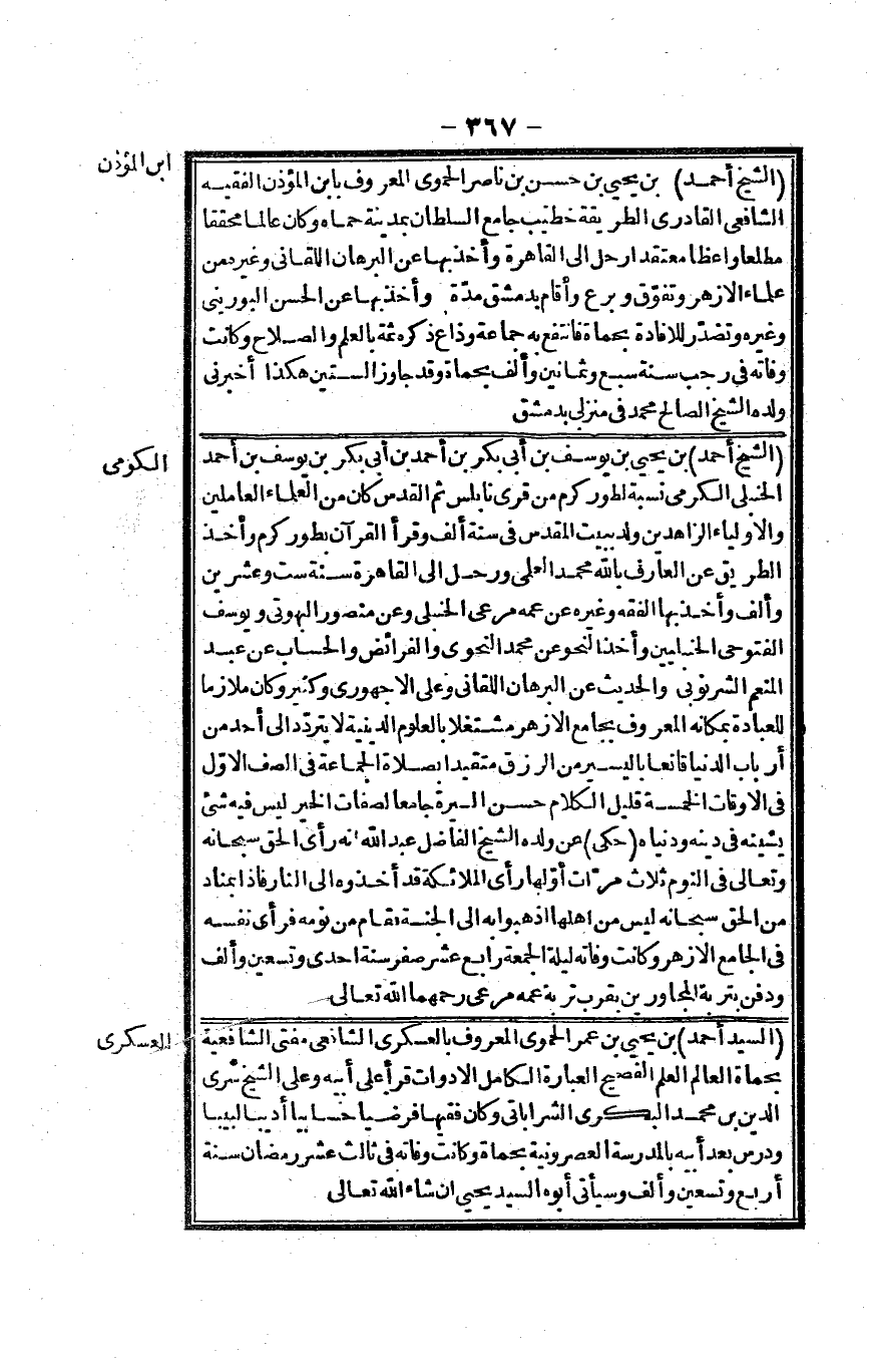 الشَّيْخ أَحْمد بن يحيى بن حسن بن نَاصِر الْحَمَوِيّ الْمَعْرُوف بِابْن الْمُؤَذّن الْفَقِيه الشَّافِعِي القادري الطَّرِيقَة خطيب جَامع السُّلْطَان بِمَدِينَة حماه وَكَانَ عَالما محققاً مطلعاً واعظاً مُعْتَقدًا رَحل إِلَى الْقَاهِرَة وَأخذ بهَا عَن الْبُرْهَان اللَّقَّانِيّ وَغَيره من عُلَمَاء الْأَزْهَر وتفوق وبرع وَأقَام بِدِمَشْق مُدَّة وَأخذ بهَا عَن الْحسن البوريني وَغَيره وتصدّر للإفادة بحماة فَانْتَفع بِهِ جمَاعَة وذاع ذكره ثمَّة بِالْعلمِ وَالصَّلَاح وَكَانَت وَفَاته فِي رَجَب سنة سبع وَثَمَانِينَ وَألف بحماة وَقد جَاوز السِّتين هَكَذَا أَخْبرنِي وَلَده الشَّيْخ الصَّالح مُحَمَّد فِي منزلي بِدِمَشْق
