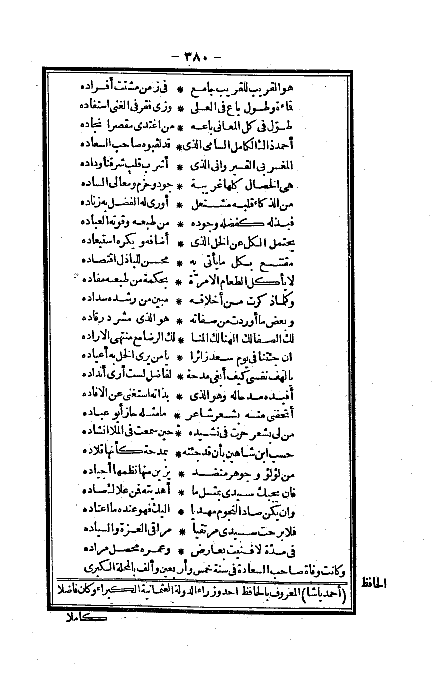 أَحْمد باشا الْمَعْرُوف بِالْحَافِظِ أحد وزراء الدولة العثمانية الكبراء وَكَانَ فَاضلا