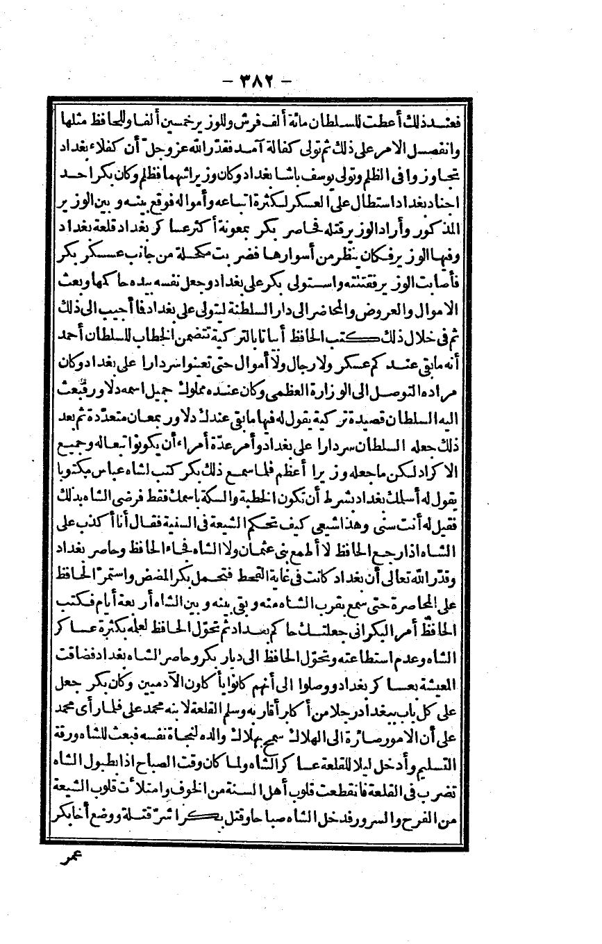 فَعِنْدَ ذَلِك أَعْطَتْ للسُّلْطَان مائَة ألف قِرْش وللوزير خمسين ألفا وللحافظ مثلهَا وانفصل الْأَمر على ذَلِك ثمَّ تولى كَفَالَة آمد فَقدر وَالله عز وَجل أَن كفلاء بَغْدَاد تجاوزوا فِي الظُّلم وَتَوَلَّى يُوسُف باشا بَغْدَاد وَكَانَ وزيراً شهماً فظلم وَكَانَ بكر أحد أجناد بَغْدَاد استطال على الْعَسْكَر لِكَثْرَة أَتْبَاعه وأمواله فَوَقع بَينه وَبَين الْوَزير الْمَذْكُور وَأَرَادَ الْوَزير قَتله فحاصر بكر بمعونة أَكثر عَسَاكِر بَغْدَاد قلعة بَغْدَاد وفيهَا الْوَزير فَكَانَ ينظر من أسوارها فَضربت مكحلة من جَانب عَسْكَر بكر فأصابت الْوَزير فَقتلته وَاسْتولى بكر على بَغْدَاد وَجعل نَفسه بيد حاكمها وَبعث الْأَمْوَال وَالْعرُوض والمحاضر إِلَى دَار السلطنة ليتولى على بَغْدَاد فَمَا أُجِيب إِلَى ذَلِك ثمَّ فِي خلال ذَلِك كتب الْحَافِظ أبياتاً بالتركية تَتَضَمَّن الْخطاب للسُّلْطَان أَحْمد أَنه مَا بَقِي عنْدكُمْ عَسْكَر وَلَا رجال وَلَا أَمْوَال حَتَّى تعينُوا سرداراً على بَغْدَاد وَكَانَ مُرَاده التَّوَصُّل إِلَى الوزارة الْعُظْمَى وَكَانَ عِنْده مَمْلُوك جميل اسْمه دلاور فَبعث إِلَيْهِ السُّلْطَان قصيدة تركية يَقُول لَهُ فِيهَا مَا بَقِي عنْدك دلاور بمعان مُتعَدِّدَة ثمَّ بعد ذَلِك جعله السُّلْطَان سرداراً على بَغْدَاد وَأمر عدَّة أُمَرَاء أَن يَكُونُوا تبعا لَهُ وَجَمِيع الأكراد لَكِن مَا جعله وزيراً أعظم فَلَمَّا سمع ذَلِك بكر كتب لشاه عَبَّاس مَكْتُوبًا يَقُول لَهُ أسلمك بَغْدَاد بِشَرْط أَن تكون الْخطْبَة وَالسِّكَّة بِاسْمِك فَقَط فَرضِي الشاه بذلك فَقيل لَهُ أَنْت سني وَهَذَا شيعي كَيفَ تحكم الشِّيعَة فِي السّنيَّة فَقَالَ أَنا أكذب على الشاه إِذا رَجَعَ الْحَافِظ لَا أطمع بني عُثْمَان وَلَا الشاه فجَاء الْحَافِظ وحاصر بَغْدَاد وَقدر الله تَعَالَى أَن بَغْدَاد كَانَت فِي غَايَة الْقَحْط فَتحمل بكر المضض وَاسْتمرّ الْحَافِظ على المحاصرة حَتَّى سمع بِقرب الشاه مِنْهُ وَبَقِي بَينه وَبَين الشاه أَرْبَعَة أَيَّام فَكتب الْحَافِظ أَمر الْبكر أَنِّي جعلتك حَاكم بَغْدَاد ثمَّ تحول الْحَافِظ لعلمه بِكَثْرَة عَسَاكِر الشاه وَعدم استطاعته وتحول الْحَافِظ إِلَى ديار بكر وحاصر الشاه بَغْدَاد فضاقت الْمَعيشَة بعساكر بَغْدَاد ووصلوا إِلَى أَنهم كَانُوا يَأْكُلُون الْآدَمِيّين وَكَانَ بكر جعل على كل بَاب بِبَغْدَاد رجلا من أكَابِر أَقَاربه وَسلم القلعة لِابْنِهِ مُحَمَّد عَليّ فَلَمَّا رأى مُحَمَّد على أَن الْأُمُور صائرة إِلَى الْهَلَاك سمح بِهَلَاك وَالِده لنجاة نَفسه فَبعث للشاه ورقة التَّسْلِيم وَأدْخل لَيْلًا للقلعة عَسَاكِر الشاه وَلما كَانَ وَقت الصَّباح إِذا بطبول الشاه تضرب فِي القلعة فَانْقَطَعت قُلُوب أهل السّنة من الْخَوْف وامتلأت قُلُوب الشِّيعَة من الْفَرح وَالسُّرُور فَدخل الشاه صباحاً وَقتل بكر شَرّ قتلة وَوضع أَخا بكر