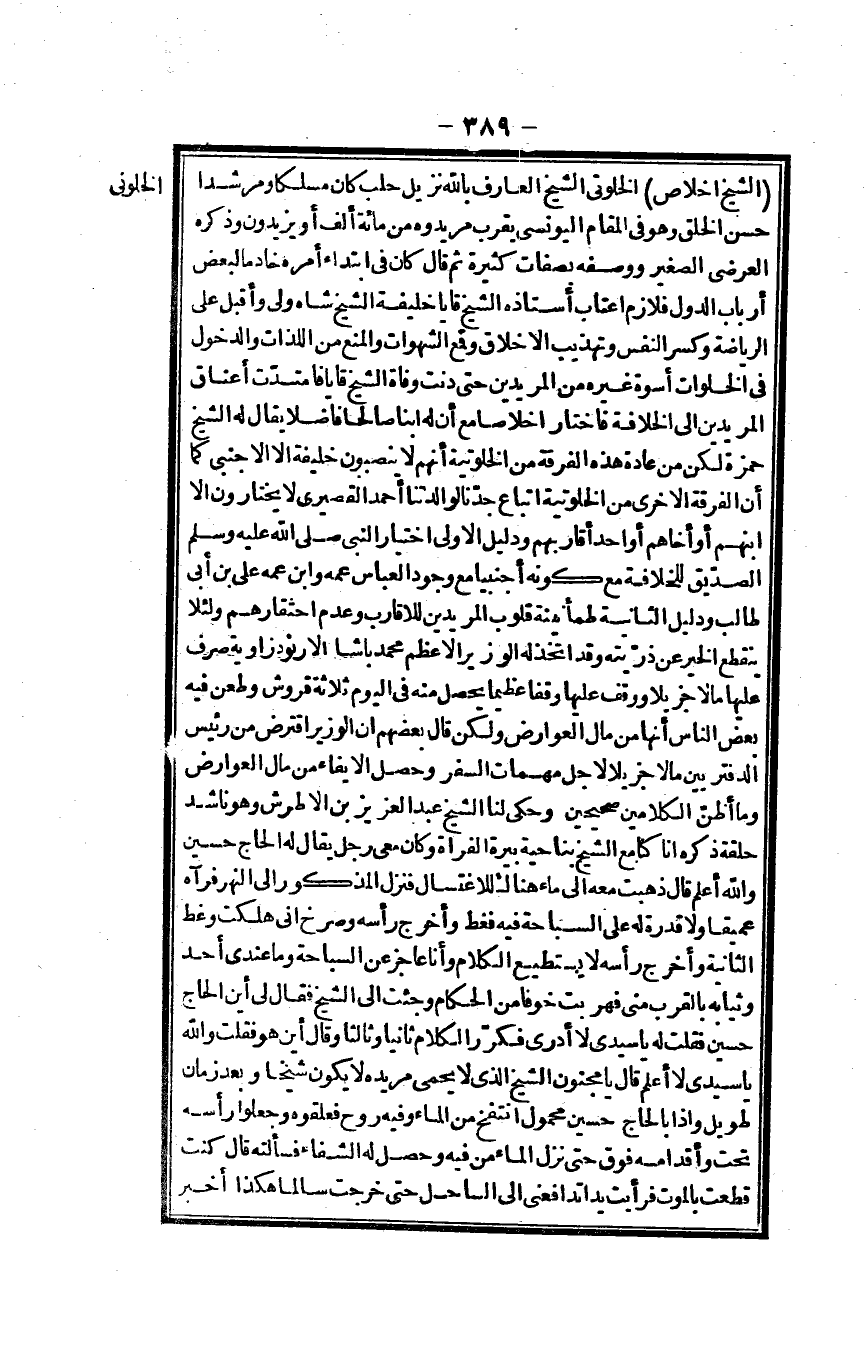 الشَّيْخ إخلاص الخلوتي الشَّيْخ الْعَارِف بِاللَّه نزل حلب كَانَ مسلكا ومرشداً حسن الْخلق وَهُوَ فِي الْمقَام اليونسي يقرب مريدوه من مائَة ألف أَو يزِيدُونَ وَذكره العرضي الصَّغِير وَوَصفه بِصِفَات كَثِيرَة ثمَّ قَالَ كَانَ فِي ابْتِدَاء أمره خَادِمًا لبَعض أَرْبَاب الدول فلازم أعتاب أستاذه الشَّيْخ قايا خَليفَة الشَّيْخ شاه ولى وَأَقْبل على الرياضة وَكسر النَّفس وتهذيب الخلاق وقمع الشَّهَوَات وَالْمَنْع من اللَّذَّات وَالدُّخُول فِي الخلوات أُسْوَة غَيره من المريدين حَتَّى دنت وَفَاة الشَّيْخ قايا فامتدت أَعْنَاق المريدين إِلَى الْخلَافَة فَاخْتَارَ إخلاصاً مَعَ أَن لَهُ ابْنا صَالحا فَاضلا يُقَال لَهُ الشَّيْخ حَمْزَة لَكِن من عَادَة هَذِه الْفرْقَة من الخلوتية أَنهم لَا ينصبون خَليفَة إِلَّا الْأَجْنَبِيّ كَمَا أَن الْفرْقَة الْأُخْرَى من الخلوتية أَتبَاع جدنا لوالدتنا أَحْمد القصيري لَا يختارون إِلَّا ابنهم أَو أَخَاهُم أَو أحد أقاربهم وَدَلِيل الأولى اخْتِيَار النَّبِي