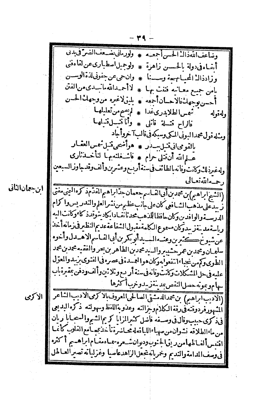 الأديب إِبْرَاهِيم بن مُحَمَّد الدِّمَشْقِي الصَّالِحِي الْمَعْرُوف بالأكرمي الأديب الشَّاعِر الْمَشْهُور فَرد وقته فِي رقة الْكَلَام وجزالته وعذوبة اللَّفْظ وسهولته ذكره البديعي فِي ذكرى حبيب وَقَالَ فِي وَصفه فَاضل كثير المزايا كريم الشيم والسجايا رَيَّان من مَاء الطلاقة نشوان من صهباء اللباقة لَهُ محاضرة تَأْخُذ بِمَجَامِع الْقُلُوب كَأَنَّمَا اقتبس ألفاظها من ريق الْجنُوب وديوان شعره سَمَّاهُ مقَام إِبْرَاهِيم أَكْثَره فِي وصف المدامة والنديم وخمرياته تجْعَل الزَّاهِد عَاصِيا وغزلياته تصير العاطل