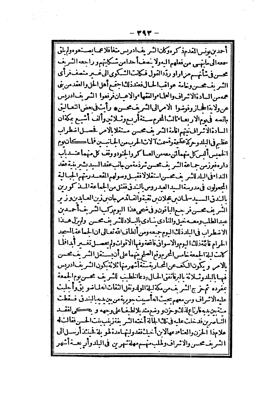 أَحْمد بن يُونُس الْمُقدم ذكره وَكَانَ الشريف إِدْرِيس متغافلاً عَمَّا يصنعوه وَلم يلق سَمعه إِلَى مَا ينْهَى من فعلهم إِلَيْهِ وَلَا ينصف أحدا من شكايتهم وراجعه الشريف محسن فِي شَأْنهمْ مرَارًا وردد القَوْل فَكَانَت الشكوى إِلَى غير منصف فَرَأى الشريف محسن وخامة عواقب الْحَال فَعِنْدَ ذَلِك اجْتمع أهل الْحل وَالْعقد من بني عَمه من السَّادة الْأَشْرَاف وَالْعُلَمَاء وَالْفُقَهَاء والأعيان فَرفعُوا الشريف إِدْرِيس عَن ولَايَة الْحجاز وفوضوا الْأَمر إِلَى الشريف محسن رَأَيْت فِي بعض التَّعَالِيق مَا نَصه فِي يَوْم الْأَرْبَعَاء ثَالِث الْمحرم سنة أَربع وَثَلَاثِينَ وَألف أشيع بِمَكَّة أَن السَّادة الْأَشْرَاف نيتهم إِقَامَة الشريف محسن مُسْتقِلّا بِالْأَمر فَحصل اضْطِرَاب عَظِيم فِي الْبَلَد وحركة عَظِيمَة وَقسمت آلَات الْحَرْب من الْجَانِبَيْنِ فَلَمَّا كَانَ يَوْم الْخَمِيس ألبس كل مِنْهُمَا لمن مَعَه من العساكر والجنود ووقف كل مِنْهُمَا عِنْد بَاب دَاره فبرز من جمَاعَة الشريف محسن شرذمة من جَانب عقد السَّيِّد بشير بنية عقد النداء فِي الْبَلَد للشريف محسن اسْتِقْلَالا فَقبل وصولهم المقعد رَمَتْهُمْ الجبالية المجعولون فِي مدرسة السَّيِّد العيدروس بالبندق فَقتل من الْجَمَاعَة الْمَذْكُورين بالبندق السَّيِّد سلمَان بن عجلَان بن ثقبة والقائد مرجان بن زين العابدين وَزِير الشريف محسن فَرجع الْبَاقُونَ وَفِي ضحى هَذَا الْيَوْم ركب الشريف أَحْمد بن عبد الْمطلب وَمَعَهُ خيل والمنادي يُنَادي بالبلاد للشريف محسن وَلم يزل هَذَا الِاضْطِرَاب فِي الْبَلَد ذَلِك الْيَوْم جَمِيعه وَمن ألطاف الله تَعَالَى أَن الْجَمَاعَة بِالْمَسْجِدِ الْحَرَام قَائِمَة ذَلِك الْيَوْم والأسواق فَاتِحَة وفيهَا الأقوات وَلم يحصل تغير أبدا فَلَمَّا كَانَت لَيْلَة الْجُمُعَة خَامِس الْمحرم وَقع الصُّلْح بَينهمَا على أَن يسْتَقلّ الشريف محسن بِالْأَمر وَيكون الْكَفّ عَن الْمُحَاربَة سِتَّة أشهر مِنْهَا ثَلَاثَة يكون الشريف إِدْرِيس فِيهَا بِالْبَلَدِ وَثَلَاثَة بِالْبرِّ فاتفق الْحَال ودعا الْخَطِيب للشريف محسن يَوْم الْجُمُعَة بمفرده ثمَّ خرج الشريف من مَكَّة لَيْلَة المولد وَنقل الثِّقَات أَنه لما ضويق وأجلبت عَلَيْهِ الْأَشْرَاف وَمن مَعَهم بِحَيْثُ أَنه أُصِيبَت جوَيْرِية من بَين يَدَيْهِ بالبندق فَسَقَطت ميتَة بَين يَدَيْهِ فارتاع لذَلِك وحزن وضع منديلاً لطيفاً على وَجهه وَبكى لفقد الناصرين فَدخلت عَلَيْهِ فِي تِلْكَ الجالة أُخْته الشَّرِيفَة زَيْنَب بنت الْحسن فَقَالَت لَهُ علام ذَا الْحزن والعناء دعها لِابْنِ أَخِيك فقد وليتها مُدَّة طَوِيلَة فحيئذ أرسل إِلَى الشريف محسن والأشراف وَطلب مِنْهُم مهلة شَهْرَيْن فِي الْبَلَد وَأَرْبَعَة أشهر