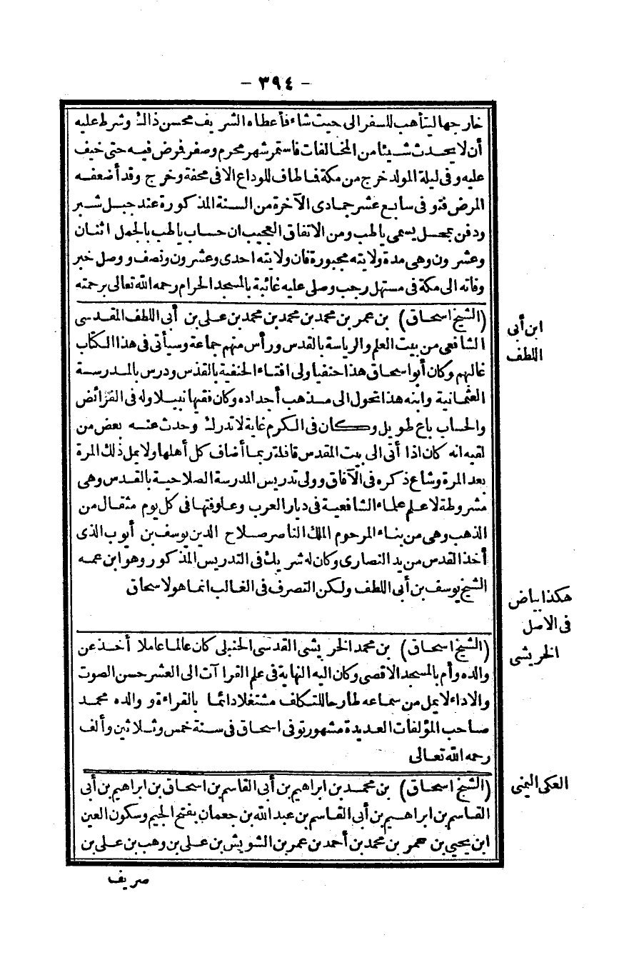 الشَّيْخ إِسْحَاق بن عمر بن مُحَمَّد بن مُحَمَّد بن مُحَمَّد بن عَليّ بن أبي اللطف الْمَقْدِسِي الشَّافِعِي من بَيت الْعلم والرياسة بالقدس وَرَأس مِنْهُم جمَاعَة وَسَيَأْتِي فِي هَذَا الْكتاب غالبهم وَكَانَ أَبُو إِسْحَاق هَذَا حنفيا ولى افتاء الْحَنَفِيَّة بالقدس ودرس بِالْمَدْرَسَةِ العثمانية وَابْنه هَذَا تحول إِلَى مَذْهَب أجداده وَكَانَ فَقِيها نبيلا وَله فِي الْفَرَائِض والحساب بَاعَ طَوِيل وَكَانَ فِي الْكَرم غَايَة لَا تدْرك وَحدث عَنهُ بعض من لقِيه أَنه كَانَ إِذا أَتَى إِلَى بَيت الْمُقَدّس قافلة رُبمَا أضَاف كل أَهلهَا وَلَا يمل ذَلِك الْمرة بعد الْمرة وشاع ذكره فِي الْآفَاق وَولى تدريس الْمدرسَة الصالحية بالقدس وَهِي مَشْرُوطَة لَا علم عُلَمَاء الشَّافِعِيَّة فِي ديار الْعَرَب وعلوفتها فِي كل يَوْم مِثْقَال من الذَّهَب وَهِي من بِنَاء المرحوم الْملك النَّاصِر صَلَاح الدّين يُوسُف بن أَيُّوب الَّذِي أَخذ الْقُدس من يَد النصاري وَكَانَ لَهُ شريك فِي التدريس الْمَذْكُور وَهُوَ ابْن عَمه الشَّيْخ يُوسُف بن أبي اللطف وَلَكِن التَّصَرُّف فِي الْغَالِب إِنَّمَا هُوَ لإسحاق