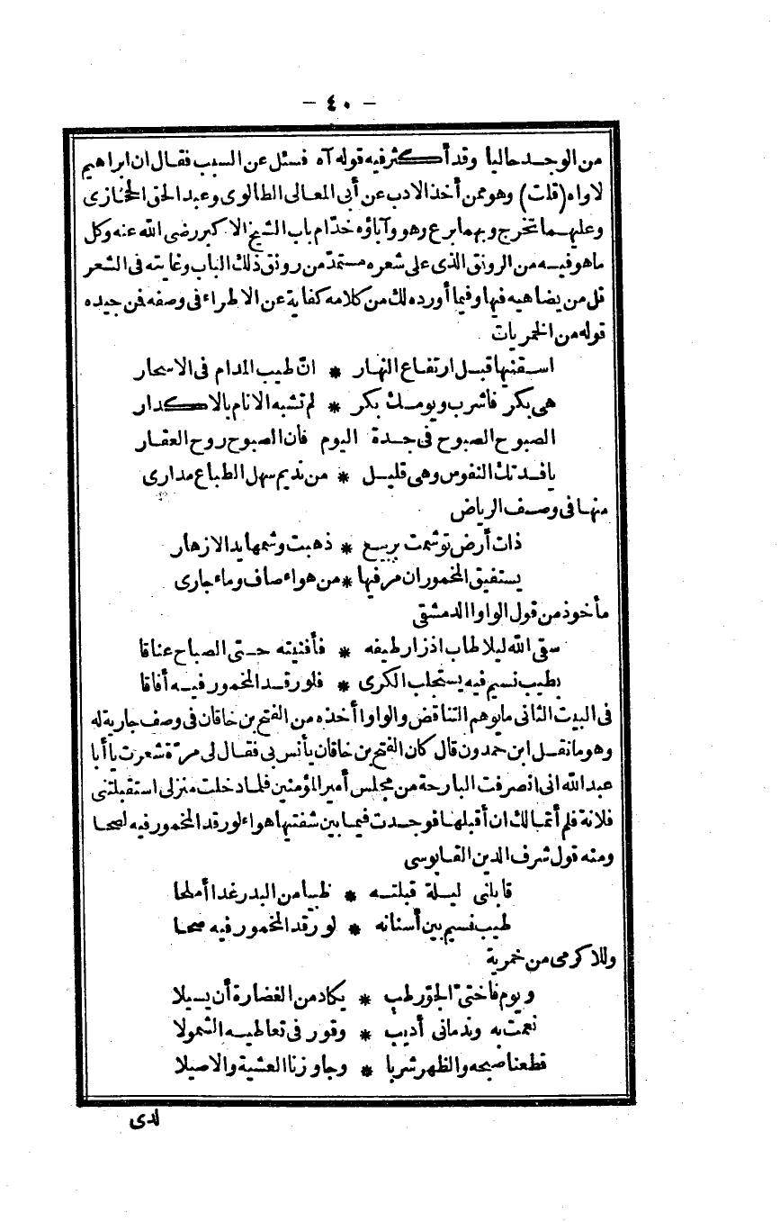 من الوجد حاليا وَقد أَكثر فِيهِ قَوْله آه فَسئلَ عَن السَّبَب فَقَالَ أَن إِبْرَاهِيم لَا واه قلت وَهُوَ مِمَّن أَخذ الْأَدَب عَن أبي الْمَعَالِي الطالوي وَعبد الْحق الْحِجَازِي وَعَلَيْهِمَا تخرج وَبِهِمَا برع وَهُوَ وآباؤه خدام بَاب الشَّيْخ الْأَكْبَر رَضِي الله عَنهُ وكل مَا هُوَ فِيهِ من الرونق الَّذِي على شعره مستمد من رونق ذَلِك الْبَاب وغايته فِي الشّعْر قل من يضاهيه فِيهَا وَفِيمَا أوردهُ لَك من كَلَامه كِفَايَة عَن الإطراء فِي وَصفه فَمن جيده قَوْله من الخمريات