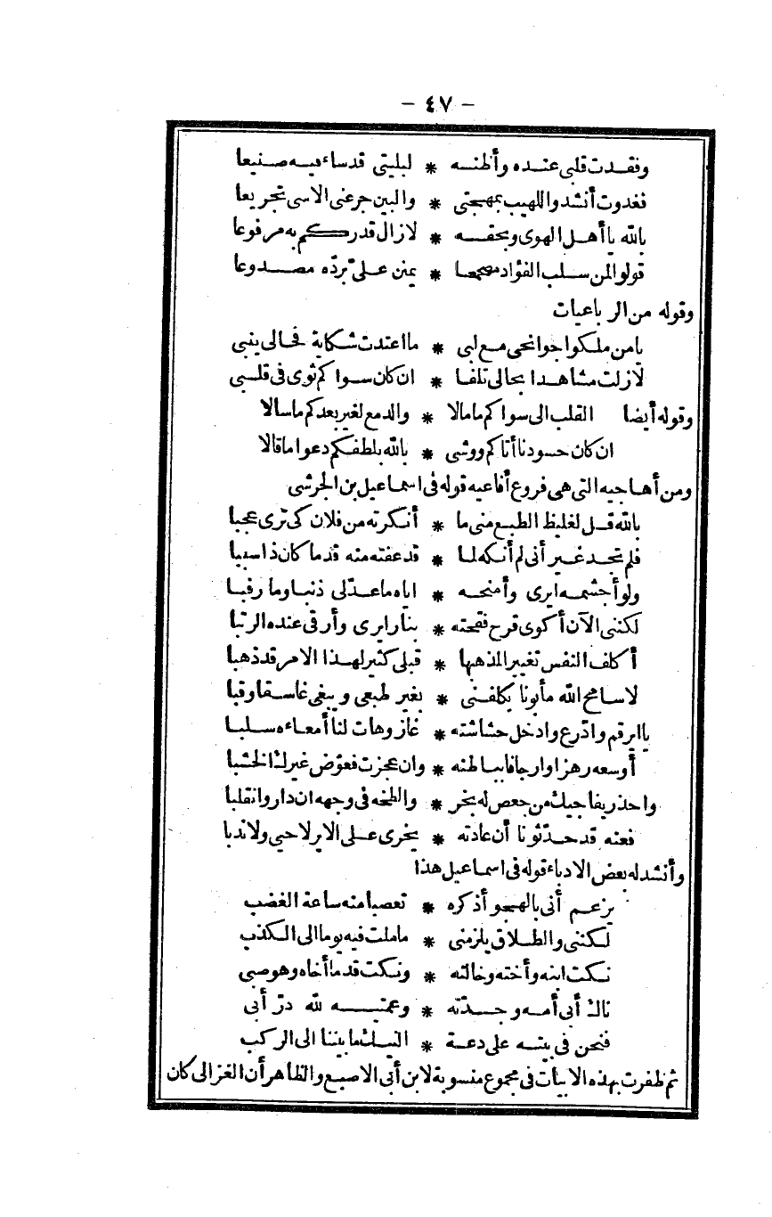 ثمَّ ظَفرت بِهَذِهِ الأبيات فِي مَجْمُوع منسوبة لِابْنِ أبي الْأصْبع وَالظَّاهِر أَن الْغَزالِيّ كَانَ