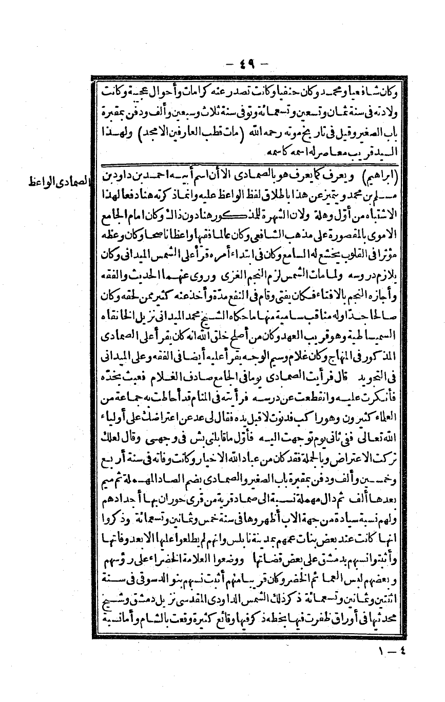 إِبْرَاهِيم وَيعرف كَمَا يعرف هُوَ بالصمادي إِلَّا أَن اسْم أَبِيه أَحْمد بن دَاوُد بن مُسلم بن مُحَمَّد ويتميز عَن هَذَا بِإِطْلَاق لفظ الْوَاعِظ عَلَيْهِ وَإِنَّمَا ذكرته هُنَا دفعا لهَذَا الِاشْتِبَاه من أوّل وهلة وَلِأَن الشُّهْرَة للمذكور هُنَا دون ذَاك وَكَانَ إِمَام الْجَامِع الْأمَوِي بالمقصورة على مَذْهَب الشَّافِعِي وَكَانَ عَالما فَقِيها واعظاً ناصحاً وَكَانَ وعظه مؤثراً يَفِ الْقُلُوب يخشع لَهُ السَّامع وَكَانَ فِي ابْتِدَاء أمره قَرَأَ على الشَّمْس الميداني وَكَانَ يلازم دروسه وَلما مَاتَ الشَّمْس لزم النَّجْم الْغَزِّي وروى عَنْهُمَا الحَدِيث وَالْفِقْه وَأَجَازَهُ النَّجْم بالإفتاء فَكَانَ يُفْتِي وَقَامَ فِي النَّفْع مُدَّة وَأخذ عَنهُ كثير مِمَّن لحقه وَكَانَ صَالحا جدا وَله مَنَاقِب سامية مِنْهَا مَا حَكَاهُ الشَّيْخ مُحَمَّد الميداني نزيل الخانقاه السميساطية وَهُوَ قريب الْعَهْد وَكَانَ من أصلح خلق الله أَنه كَانَ يقْرَأ على الصمادي الْمَذْكُور فِي الْمِنْهَاج وَكَانَ غُلَام وسيم الْوَجْه يقْرَأ عَلَيْهِ أَيْضا فِي الْفِقْه وعَلى الميداني فِي التجويد قَالَ فَرَأَيْت الصمادي يَوْمًا فِي الْجَامِع صَادف الْغُلَام فعبث بخدّه فأنكرت عَلَيْهِ وانقطعت عَن درسه فرأيته فِي الْمَنَام قد أحاطت بِهِ جمَاعَة من الْعلمَاء كَثِيرُونَ وَهُوَ رَاكب فدنوت لأقبل يَده فَقَالَ لي عد عَن اعتراضك على أَوْلِيَاء الله تَعَالَى فَفِي ثَانِي يَوْم تَوَجَّهت إِلَيْهِ فَأول مَا قابلني بشّ فِي وَجْهي وَقَالَ لَعَلَّك تركت الِاعْتِرَاض وَبِالْجُمْلَةِ فقد كَانَ من عباد الله الأخيار وَكَانَت وَفَاته فِي سنة أَربع وَخمسين وَألف وَدفن بمقبرة بَاب الصَّغِير والصمادي بِضَم الصَّاد الْمُهْملَة ثمَّ مِيم بعْدهَا ألف ثمَّ دَال مُهْملَة نِسْبَة إِلَى صماد قَرْيَة من قرى حوران بهَا أجدادهم وَلَهُم نِسْبَة سيادة من جِهَة الْأَب أظهروها فِي سنة خمس وَثَمَانِينَ وَتِسْعمِائَة وَذكروا أَنَّهَا كَانَت عِنْد بعض بَنَات عمهم بِمَدِينَة نابلس وَأَنَّهُمْ لم يطلعوا عَلَيْهَا إِلَّا بعد وفاتها وأثبتوا نسبهم بِدِمَشْق على بعض قضاتها وَوَضَعُوا الْعَلامَة الخضراء على رؤوسهم وَبَعْضهمْ لبس العمائم الْخضر وَكَانَ قَرِيبا مِنْهُم وَأثبت نسبهم بَنو الدسوقي فِي سنة اثْنَتَيْنِ وَثَمَانِينَ وَتِسْعمِائَة ذكر ذَلِك الشَّمْس الدَّاودِيّ الْمَقْدِسِي نزيل دمشق وَشَيخ محدثيها فِي أوراق ظَفرت فِيهَا بِخَطِّهِ ذكر فِيهَا وقائع كَثِيرَة وَقعت بِالشَّام وأمما نِسْبَة