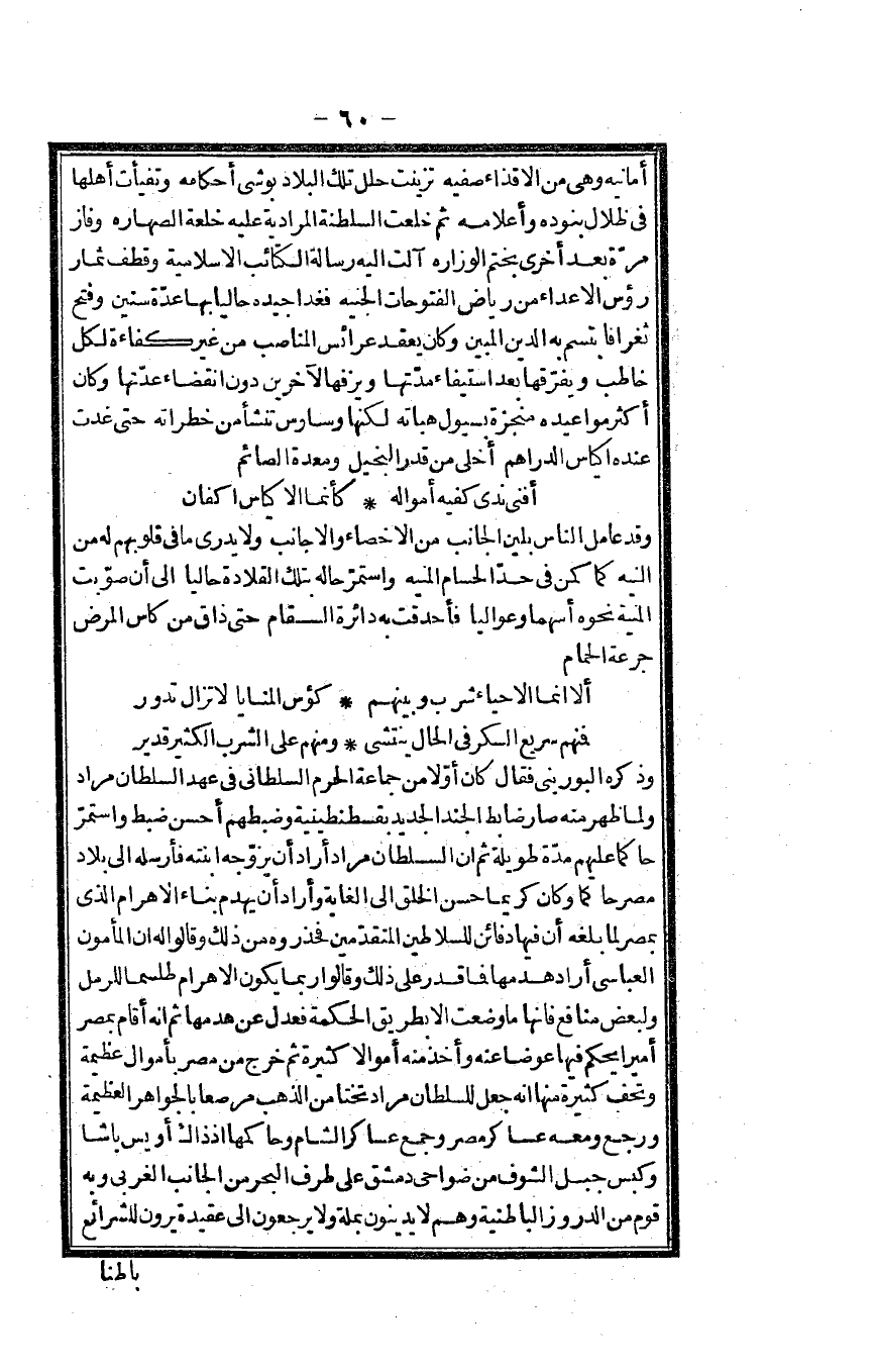 أمانيه وَهِي من الأقذاء صَفِيَّة تزينت حلل تِلْكَ الْبِلَاد بوشي أَحْكَامه وتفيأت أَهلهَا فِي ظلال بنوده وأعلامه ثمَّ خلعت السلطنة المرادية عَلَيْهِ خلعة الصهاره وفاز مرّة بعد أُخْرَى بِخَتْم الوزارة آلت إِلَيْهِ رِسَالَة الْكَتَائِب الإسلامية وقطف ثمار رُؤْس الْأَعْدَاء من رياض الفتوحات الجنية فغدا جيده حالياً بهَا عدَّة سِنِين وَفتح ثغراً فابتسم بِهِ الدّين الْمُبين وَكَانَ يعْقد عرائس المناصب من غير كفاءة لكل خَاطب ويفرّقها بعد اسْتِيفَاء مدّتها ويزفها لآخرين دون انْقِضَاء عدتهَا وَكَانَ أَكثر مواعيده منجزة بسيول هباته لَكِنَّهَا وساوس تنشأ من خطراته حَتَّى غَدَتْ عِنْده أكياس الدَّرَاهِم أخلى من قدر الْبَخِيل ومعدة الصَّائِم