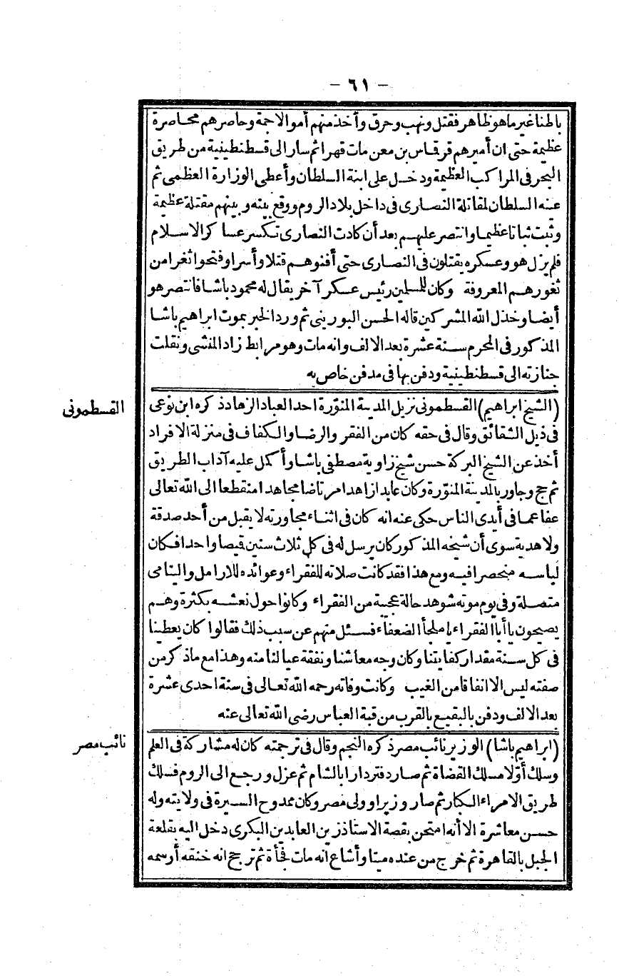 إِبْرَاهِيم باشا الْوَزير نَائِب مصر ذكره النَّجْم وَقَالَ فِي تَرْجَمته كَانَ لَهُ مُشَاركَة فِي الْعلم وسلك أَولا مَسْلَك الْقُضَاة ثمَّ صَار دفترداراً بِالشَّام ثمَّ عزل وَرجع إِلَى الرّوم فسلك طَرِيق الْأُمَرَاء الْكِبَار ثمَّ صَار وزيراً ولي مصر وَكَانَ ممدوح السِّيرَة فِي ولَايَته وَله حسن معاشرة إِلَّا أَنه امتحن بِقصَّة الْأُسْتَاذ زين العابدين الْبكْرِيّ دخل إِلَيْهِ بقلعة الْجَبَل بِالْقَاهِرَةِ ثمَّ خرج من عِنْده مَيتا وأشاع أَنه مَاتَ فَجْأَة ثمَّ ترجح أَنه خنقه أَو سمّه