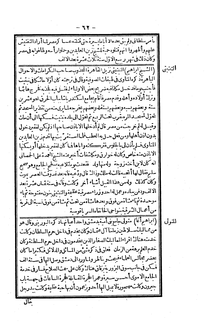 الشَّيْخ إِبْرَاهِيم النبتيتي نزيل الْقَاهِرَة المجذوب صَاحب الكرامات وَالْأَحْوَال الباهرة ذكره الْمَنَاوِيّ فِي طَبَقَات الصُّوفِيَّة وَقَالَ فِي تَرْجَمته كَانَ أَولا حائكاً فِي نبتيت فأجنب يَوْمًا فَدخل مَكَانا فِيهِ ضريح بعض الْأَوْلِيَاء ليغتسل فِيهِ فَجَذَبَهُ فَخرج هائماً وَترك أَوْلَاده وَأَهله وَقدم مصر فَأَقَامَ بِجَامِع اسكندر باشا بِبَاب الْخرق نَحْو عشْرين سنة وَبَعْضهمْ يسبه وَبَعْضهمْ يستقله وَبَعْضهمْ يُخرجهُ لما يرى مِنْهُ من تقذير الْمَسْجِد ثمَّ تحوّل لمَسْجِد الْمرة بِقرب تَحت الرّبع ثمَّ تحوّل إِلَى بَلَده نبتيت فسكنها إِلَى أَن مَاتَ وَقيل لَهُ لم خرجت من مصر قَالَ لم أدخلها إِلَّا بِإِذن صَاحبهَا إِذْ لم يكن لفقير دُخُول بِدُونِ إِذن أَهلهَا وَمن فعل حل بِهِ العطب فَلَمَّا استقرّيت بهَا قدم زين العابدين الْمَنَاوِيّ فَلم يَأْذَن لي بِالْجُلُوسِ فتركته وَإِيَّاهَا فَمَا كَانَ لفقير يدخلهَا أَو يسكنهَا إِلَّا بِإِذن مِنْهُ خَاص وَكَانَ لَهُ خوارق ومكاشفات أخبر عَنهُ الشَّيْخ الْعُمْدَة عَليّ الحمصاني أَنه كَانَ لِابْنِ أُخْته زَوْجَة وَله مِنْهَا ولد فَقَعَدت يَوْمًا تلاعبه بسطح الْجَامِع وَهُوَ صَحِيح سليم فَقَالَ لَهَا أتحبيه قَالَت لَهُ مَالك وَذَاكَ قَالَ ودّعيه فَإِنَّهُ بعد غَد وَقت الْعَصْر يَمُوت وَكَانَ كَذَلِك وَله من هَذَا الْقَبِيل أَشْيَاء أخر وَكَانَت وَفَاته فِي سنة ثَمَان عشرَة بعد الْألف وَدفن بِبَلَدِهِ وَعمل لَهُ أحد وزراء مصر قبَّة عَظِيمَة والنبتيتي بنُون مَفْتُوحَة ثمَّ بَاء مُوَحدَة ثمَّ تَاء مثناة من فَوق وَبعدهَا مثناة من تَحت ثمَّ مثناة من فَوق نِسْبَة إِلَى قَرْيَة من أَعمال الشرقية بنواحي الخانقاه السرياقوسية