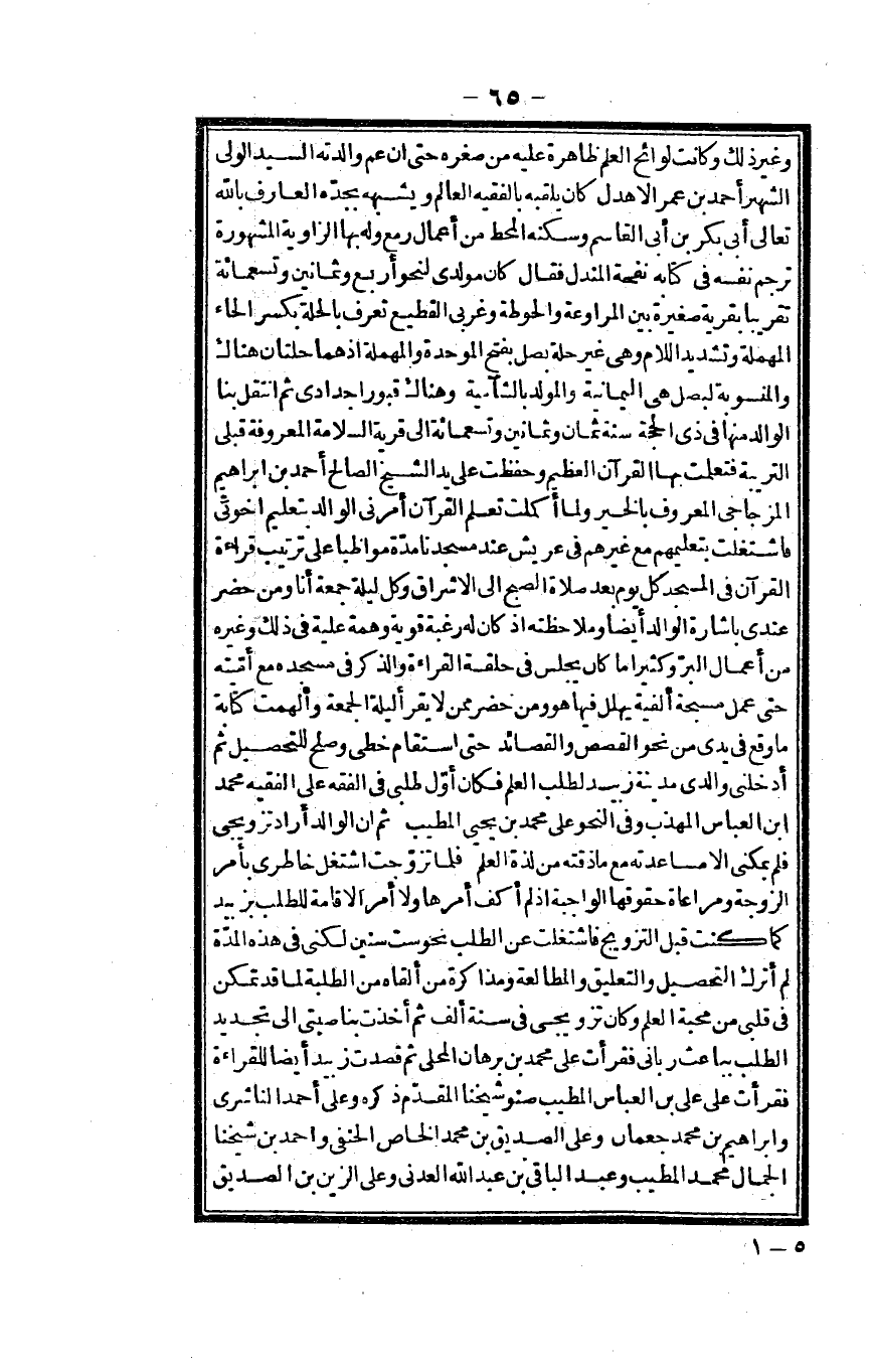 وَغير ذَلِك وَكَانَت لوائح الْعلم ظَاهِرَة عَلَيْهِ من صغره حَتَّى إِن عَم والدته السَّيِّد الْوَلِيّ الشهير أَحْمد بن عمر الأهدل كَانَ يلقبه بالفقيه الْعَالم يُشبههُ بجده الْعَارِف بِاللَّه تَعَالَى أبي بكر بن أبي الْقَاسِم وسكنه المحط من أَعمال رمع وَله بهَا الزاوية الْمَشْهُورَة ترْجم نَفسه فِي كِتَابه نفحة المندل فَقَالَ كَانَ مولدِي لنَحْو أَربع وَثَمَانِينَ وَتِسْعمِائَة تَقْرِيبًا بقرية صَغِيرَة بَين المراوعة والحوطة وَغَرْبِيٌّ القطيع تعرف بالحلة بِكَسْر الْحَاء الْمُهْملَة وَتَشْديد اللَّام وَهِي غير حلَّة بصل بِفَتْح الْمُوَحدَة والمهملة إِذْ هما حلتان هُنَاكَ والمنسوبة لبصل هِيَ اليمانية والمولد بالشامية وَهُنَاكَ قُبُور أجدادي ثمَّ انْتقل بِنَا الْوَالِد مِنْهَا فِي ذِي الْحجَّة سنة ثَمَان وَثَمَانِينَ وَتِسْعمِائَة إِلَى قَرْيَة السَّلامَة الْمَعْرُوفَة قبلي التربية فتعلمت بهَا الْقُرْآن الْعَظِيم وحفظت على يَد الشَّيْخ الصَّالح أَحْمد بن إِبْرَاهِيم المزجاجي الْمَعْرُوف بِالْخَيرِ وَلما أكملت تعلم الْقُرْآن أَمرنِي الْوَالِد بتعليم إخوتي فاشتغلت بتعليمهم مَعَ غَيرهم فِي عَرِيش عِنْد مَسْجِدنَا مُدَّة مواظباً على تَرْتِيب قِرَاءَة الْقُرْآن فِي الْمَسْجِد كل يَوْم بعد صَلَاة الصُّبْح إِلَى الْإِشْرَاق وكل لَيْلَة جُمُعَة أَنا وَمن حضر عِنْدِي بِإِشَارَة الْوَالِد أَيْضا وملاحظته إِذْ كَانَ لَهُ رَغْبَة قَوِيَّة وهمة علية فِي ذَلِك وَغَيره من أَعمال الْبر وَكَثِيرًا مَا كَانَ يجلس فِي حَلقَة الْقِرَاءَة وَالذكر فِي مَسْجِد مَعَ أُميَّة حَتَّى عمل مسبحة ألفية يهلل فِيهَا هُوَ وَمن حضر مِمَّن لَا يقْرَأ لَيْلَة الْجُمُعَة وألهمت كِتَابَة مَا وَقع فِي يَدي من نَحْو الْقَصَص والقصائد حَتَّى اتسقام خطي وَصلح للتحصيل ثمَّ أدخلني وَالِدي مَدِينَة زبيد لطلب الْعلم فَكَانَ أول طلبي فِي الْفِقْه على الْفَقِيه مُحَمَّد ابْن الْعَبَّاس الْمُهَذّب وَفِي النَّحْو على مُحَمَّد بن يحيى المطيب ثمَّ إِن الْوَالِد أَرَادَ تزويجي فَلم يمكني إِلَّا مساعدته مَعَ مَا ذقته من لَذَّة الْعلم فَلَمَّا تزوجت اشْتغل خاطري بِأَمْر الزَّوْجَة ومراعاة حُقُوقهَا الْوَاجِبَة إِذْ لم أكف أمرهَا وَلَا أَمر الْإِقَامَة للطلب بزبيد كَمَا كنت قبل التَّزْوِيج فاشتغلت عَن الطّلب نَحْو سِتّ سِنِين لكني فِي هَذِه الْمدَّة لم أترك التَّحْصِيل وَالتَّعْلِيق والمطالعة ومذاكرة من أَلْقَاهُ من الطّلبَة لما قد تمكن فِي قلبِي من محبَّة الْعلم وَكَانَ تزويجي فِي سنة ألف ثمَّ أخدت بناصيتي إِلَى تَجْدِيد الطّلب بباعث رباني فَقَرَأت على مُحَمَّد بن برهَان الْمحلي ثمَّ قصدت زبيد أَيْضا للْقِرَاءَة فَقَرَأت على عَليّ بن الْعَبَّاس المطيب صنو شَيخنَا الْمُقدم ذكره وعَلى أَحْمد النَّاشِرِيّ وَإِبْرَاهِيم بن مُحَمَّد جعمان وعَلى الصّديق بن مُحَمَّد الْخَاص الْحَنَفِيّ وَأحمد بن شَيخنَا الْجمال مُحَمَّد المطيب وَعبد الْبَاقِي بن عبد الله الْعَدنِي وَعلي الزين بن الصّديق