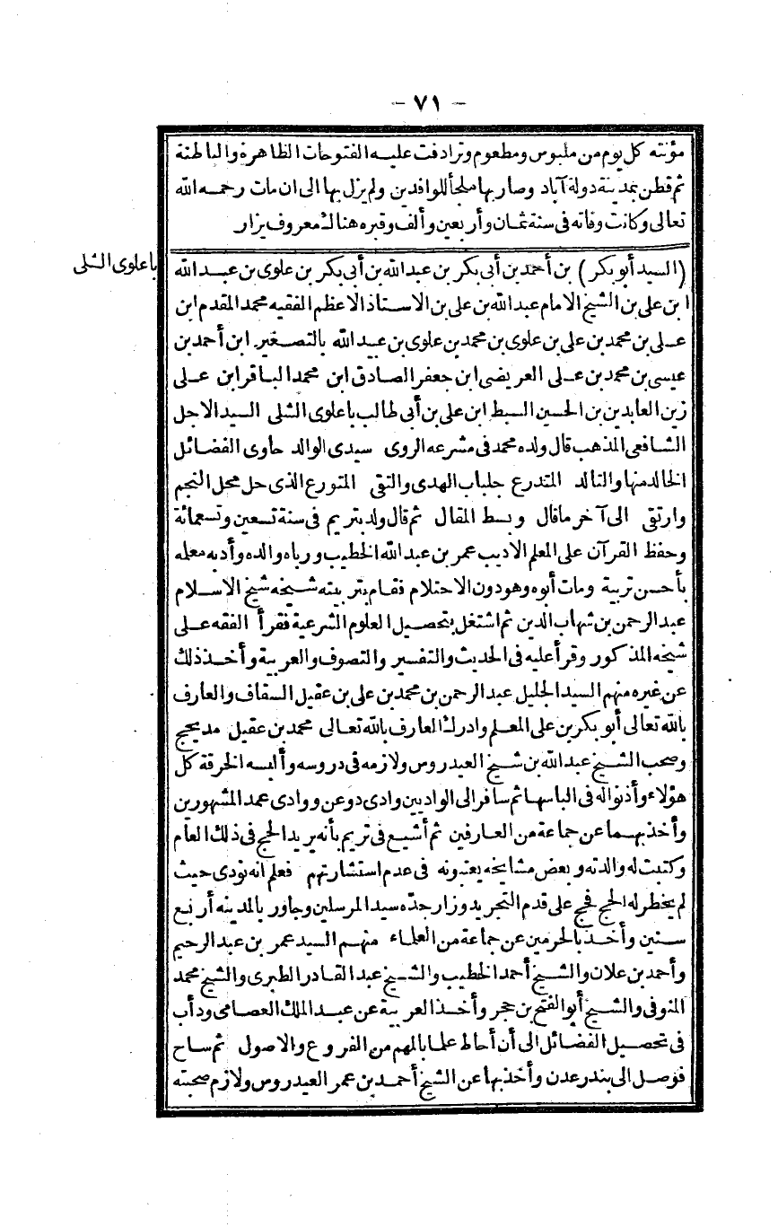 السَّيِّد أَبُو بكر بن أَحْمد بن أبي بكر بن عبد الله بن أبي بكر بن علوي بن عبد الله ابْن عَليّ بن الشَّيْخ الإِمَام عبد الله بن عَليّ بن الْأُسْتَاذ الْأَعْظَم الْفَقِيه مُحَمَّد الْمُقدم ابْن عَليّ بن مُحَمَّد بن عَليّ بن علوي بن مُحَمَّد بن علوي بن عبيد الله بالتصغر ابْن أَحْمد بن عِيسَى بن مُحَمَّد بن عَليّ العريضي ابْن جَعْفَر الصَّادِق ابْن مُحَمَّد الباقر ابْن عَليّ زين العابدين بن الْحُسَيْن السبط ابْن عَليّ بن أبي طَالب باعلوي الشلي السَّيِّد الْأَجَل الشَّافِعِي الْمَذْهَب قَالَ وَلَده مُحَمَّد فِي مشرعه الروى سَيِّدي الْوَالِد حاوي الْفَضَائِل الخالد مِنْهَا والتالد المتدرع جِلْبَاب الْهدى والتقى المتورع الَّذِي حل مَحل النَّجْم وارتقى إِلَى آخر مَا قَالَ وَبسط الْمقَال ثمَّ قَالَ ولد بتريم فِي سنة تسعين وَتِسْعمِائَة وَحفظ الْقُرْآن على الْمعلم الآديب عمر بن عبد الله الْخَطِيب ورباه وَالِده وأدبه معلمه بِأَحْسَن تربية وَمَات أَبوهُ وهودون الأحتلام فَقَامَ بتربيته شَيْخه شيخ الْإِسْلَام عبد الرَّحْمَن بن شهَاب الدّين ثمَّ اشْتغل بتحصيل الْعُلُوم الشَّرْعِيَّة فَقَرَأَ الْفِقْه على شَيْخه الْمَذْكُور وَقَرَأَ عَلَيْهِ فِي الحَدِيث وَالتَّفْسِير والتصوف والعربية وَأخذ ذَلِك عَن غَيره مِنْهُم السَّيِّد الْجَلِيل عبد الرَّحْمَن بن مُحَمَّد بن عَليّ بن عقيل السقاف والعارف بِاللَّه تَعَالَى أَبُو بكر بن عَليّ الْمعلم وَأدْركَ الْعَارِف بِاللَّه تَعَالَى مُحَمَّد بن عقيل مديحج وَصَحب الشَّيْخ عبد الله بن شيخ العيدروس ولازمه فِي دروسه وَألبسهُ الْخِرْقَة كل هَؤُلَاءِ وأذنوا لَهُ فِي ألباسها ثمَّ سَافر إِلَى الواديين وَادي دوعن ووادي عمد الْمَشْهُورين وَأخذ بهما عَن جمَاعَة من العارفين ثمَّ أشيع فِي تريم بِأَنَّهُ يُرِيد الْحَج فِي ذَلِك الْعَام وكتبت لَهُ والدته وَبَعض مشايخه يعتبونه فِي عدم استشارتهم فَعلم أَنه نُودي حَيْثُ لم يخْطر بِهِ الْحَج فحج على قدم التَّجْرِيد وزار جده سيد الْمُرْسلين وجاور بِالْمَدِينَةِ أَربع سِنِين وَأخذ بالحرمين عَن جمَاعَة من الْعلمَاء مِنْهُم السَّيِّد عمر بن عبد الرَّحِيم وَأحمد بن عَلان وَالشَّيْخ أَحْمد الْخَطِيب وَالشَّيْخ عبد الْقَادِر الطَّبَرِيّ وَالشَّيْخ مُحَمَّد المنوفي وَالشَّيْخ أَبُو الْفَتْح بن حجر وَأخذ الْعَرَبيَّة عَن عبد الْملك العصامي ودأب فِي تَحْصِيل الْفَضَائِل إِلَى أَن أحَاط علما بالمهم من الْفُرُوع وَالْأُصُول ثمَّ ساح فوصل إِلَى بندر عدن وَأخذ بهَا عَن الشَّيْخ أَحْمد بن عمر العيدروس ولازم صُحْبَة
