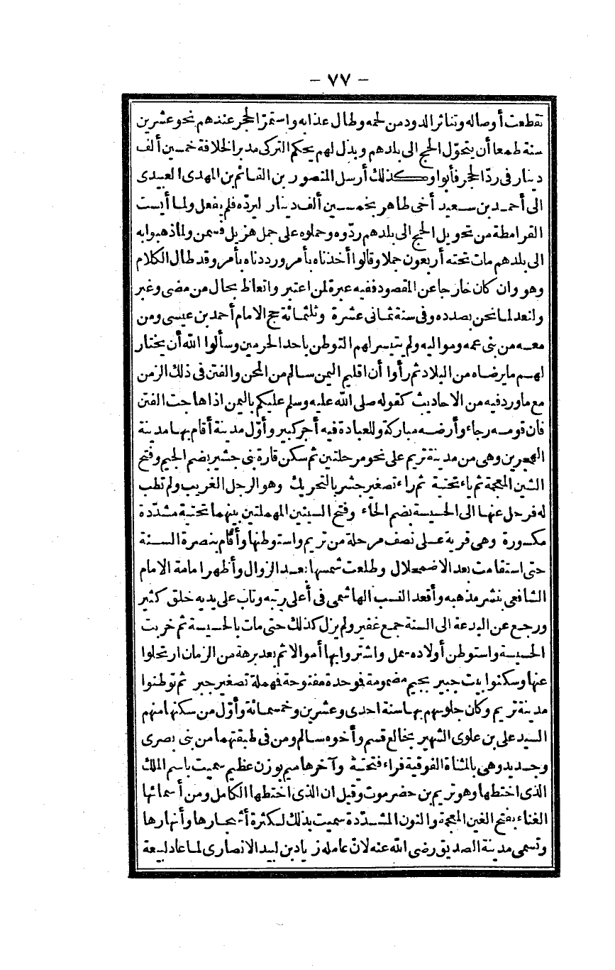 تقطعت أوصاله وتناثر الدُّود من لَحْمه وَطَالَ عَذَابه وَاسْتمرّ الْحجر عِنْدهم نَحْو عشْرين سنة طَمَعا أَن يتَحَوَّل الْحَج إِلَى بلدهم وبذل لَهُم يحكم التركي مُدبر الْخلَافَة خمسين ألف دِينَار فِي ردّ الْحجر فَأَبَوا وَكَذَلِكَ أرسل الْمَنْصُور بن الْقَائِم بن الْمهْدي العبيدي إِلَى أَحْمد بن سعيد أخي طَاهِر بِخَمْسِينَ ألف دِينَار ليَرُدهُ فَلم يفعل وَلما أَيِست القرامطة من تَحْويل الْحَج إِلَى بلدهم ردُّوهُ وَحَمَلُوهُ على جمل هزيل فسمن وَلما ذَهَبُوا بِهِ إِلَى بلدهم مَاتَ تَحْتَهُ أَرْبَعُونَ جملا وَقَالُوا أخذناه بِأَمْر ورددناه بِأَمْر وَقد طَال الْكَلَام وَهُوَ وَإِن كَانَ خَارِجا عَن الْمَقْصُود فَفِيهِ عِبْرَة لمن اعْتبر واتعاظ بِحَال من مضى وغبر ولنعد لما نَحن بصدده وَفِي سنة ثَمَانِي عشرَة وثلثمائة حج الإِمَام أَحْمد بن عِيسَى وَمن مَعَه من بني عَمه ومواليه وَلم يَتَيَسَّر لَهُم التوطن بِأحد الْحَرَمَيْنِ وسألوا الله أَن يخْتَار لَهُم مَا يرضاه من الْبِلَاد ثمَّ رَأَوْا أَن إقليم الْيمن سَالم من المحن والفتن فِي ذَلِك الزَّمن مَعَ مَا ورد فِيهِ من الْأَحَادِيث كَقَوْلِه