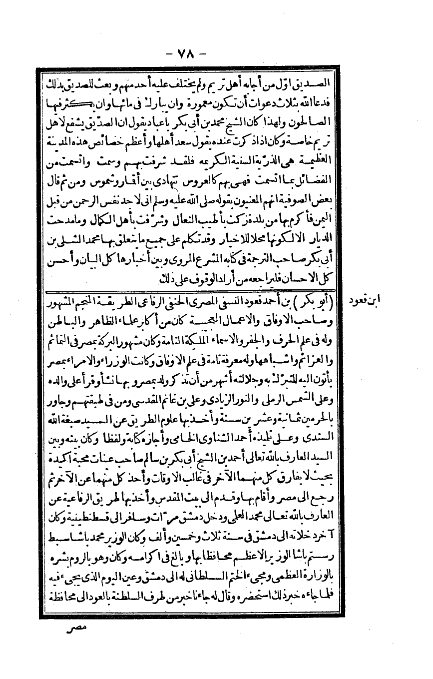 أَبُو بكر بن أَحْمد قعُود النَّسَفِيّ الْمصْرِيّ الْحَنَفِيّ الرِّفَاعِي الطَّرِيقَة المنجم الْمَشْهُور وَصَاحب الأوفاق والأعمال العجيبة كَانَ من أكَابِر عُلَمَاء الظَّاهِر وَالْبَاطِن وَله فِي علم الْحَرْف والجفر والأسماء الملكة التَّامَّة وَكَانَ مَشْهُور الْبركَة بِمصْر فِي التمائم والعزائم وأشباهها وَله معرفَة تَامَّة فِي علم الأوفاق وَكَانَت الوزراء والأمراء بِمصْر يأْتونَ إِلَيْهِ للتبرك بِهِ وجلالته أشهر من أَن تذكر ولد بِمصْر وَبهَا نَشأ وَقَرَأَ على وَالِده وعَلى الشَّمْس الرَّمْلِيّ والنور الزيَادي وعَلى بن غَانِم الْمَقْدِسِي وَمن فِي طبقتهم وجاور بالحرمين ثَمَانِيَة وَعشْرين سنة وَأخذ بهَا عُلُوم الطَّرِيق عَن السَّيِّد صبغة الله السندي وعَلى تِلْمِيذه أَحْمد الشناوي الخامي وَأَجَازَهُ كِتَابَة ولفظاً وَكَانَ بَينه وَبَين السَّيِّد الْعَارِف بِاللَّه تَعَالَى أَحْمد بن الشَّيْخ أبي بكر بن سَالم صَاحب عينات محبَّة أكيدة بِحَيْثُ لَا يُفَارق كل مِنْهُمَا الآخر فِي غَالب الْأَوْقَات وَأخذ كل مِنْهُمَا عَن الآخر ثمَّ رَجَعَ إِلَى مصر وَأقَام بهَا وَقدم إِلَى بَيت الْمُقَدّس وَأخذ بهَا طَرِيق الرفاعية عَن الْعَارِف بِاللَّه تَعَالَى مُحَمَّد العلمي وَدخل دمشق مَرَّات وسافر إِلَى قسطنطينية وَكَانَ آخر دخلاته إِلَى دمشق فِي سنة ثَلَاث وَخمسين وَألف وَكَانَ الْوَزير مُحَمَّد باشا سبط رستم باشا الْوَزير الْأَعْظَم محافظاً بهَا وَبَالغ فِي إكرامه وَكَانَ وَهُوَ بالروم بشره بالوزارة الْعُظْمَى ومجيء الْخَتْم السلطاني لَهُ إِلَى دمشق وَعين الْيَوْم الَّذِي يَجِيء فِيهِ فَلَمَّا جَاءَهُ خبر ذَلِك استحضره وَقَالَ لَهُ جَاءَنَا خبر من طرف السلطنة بِالْعودِ إِلَى مُحَافظَة
